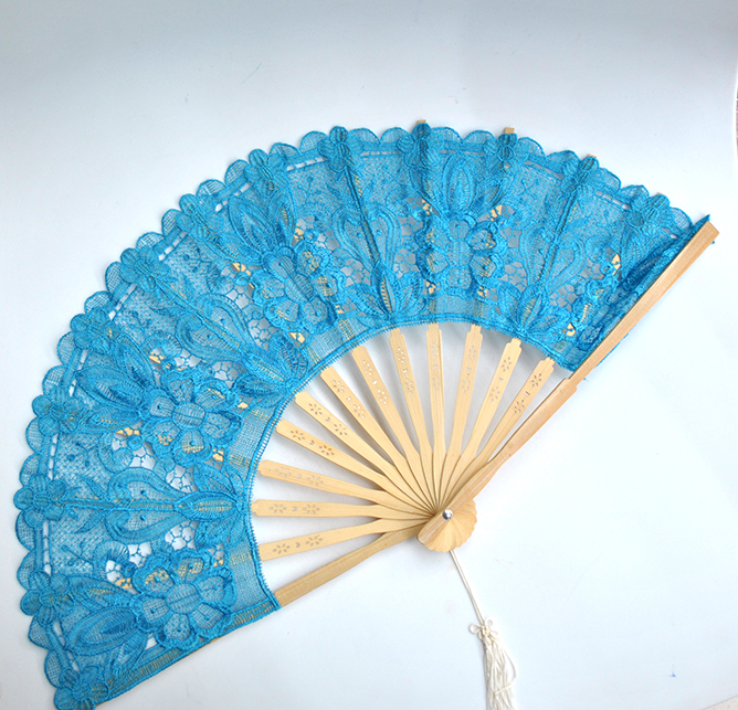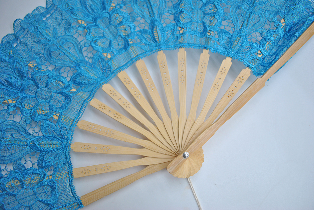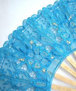 Precioso abanico de madera color AZUL decorado con encajes bordados con hilos formando motivos florales. Muy práctico además para refrescarte y marcar estilazo.