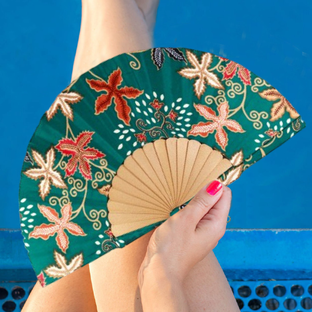 Abanico de madera con tela verde y hojas en tonos rojos.