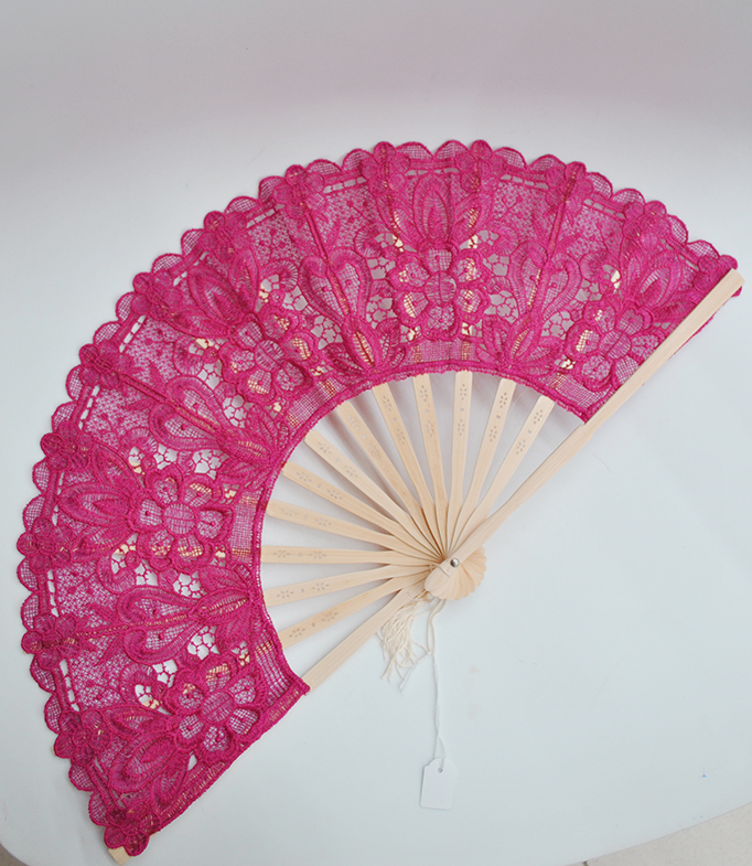 Precioso abanico de madera color ROSA FUCSIA decorado con encajes bordados con hilos formando motivos florales. Muy práctico además para refrescarte y marcar estilazo.