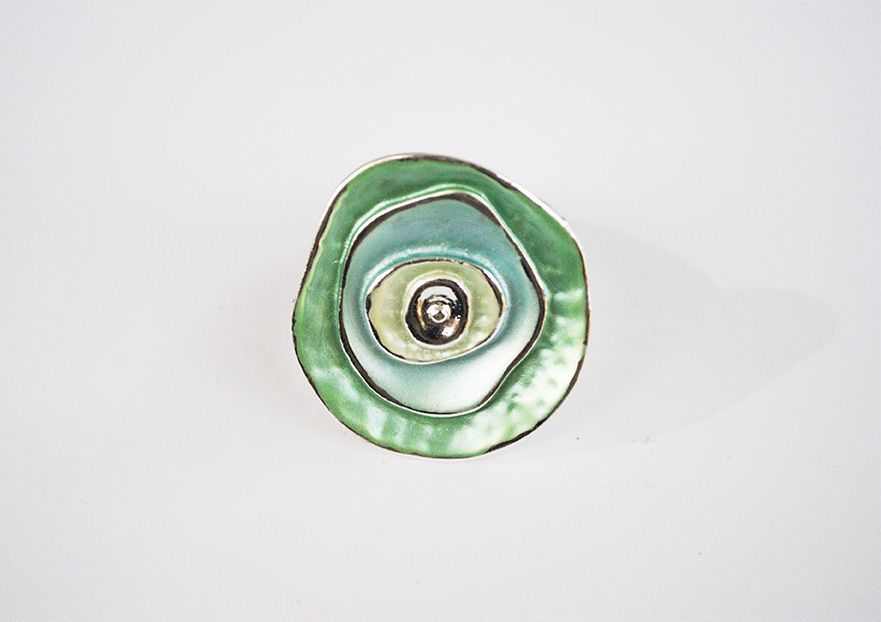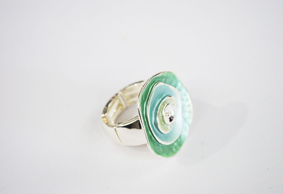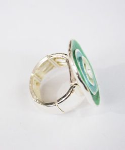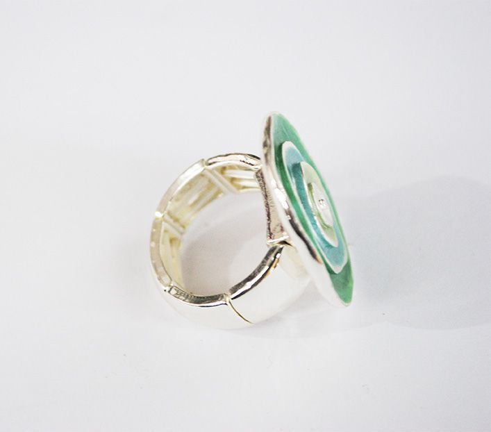 Elegante anillo de mujer fabricado en bisutería plateada. Muy cómodo y se ajusta perfectamente al dedo gracias a la goma elástica que tiene. Presenta el diseño en forma de círculos irregulares combinando esmaltes mate en color verde agua y turquesa.