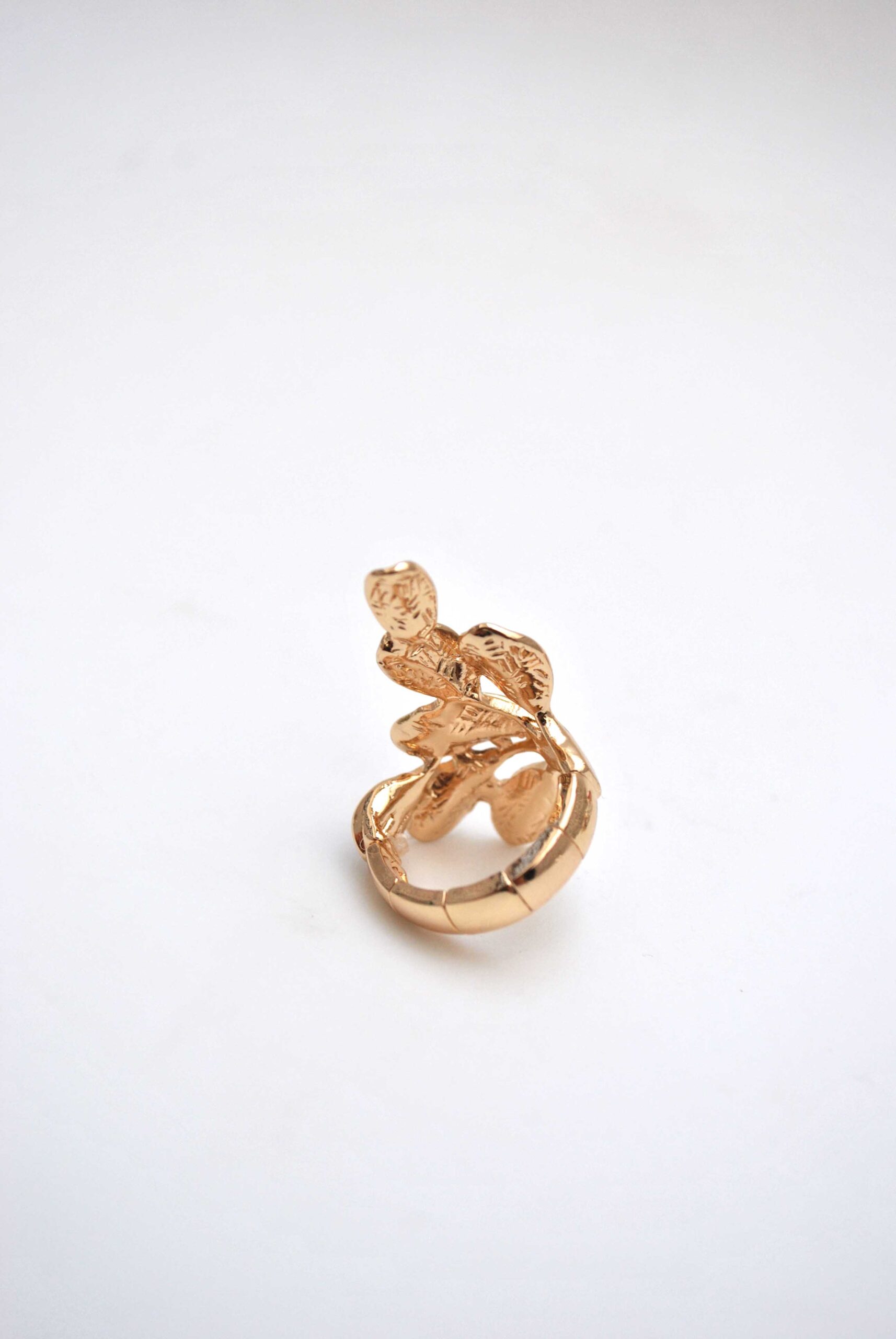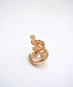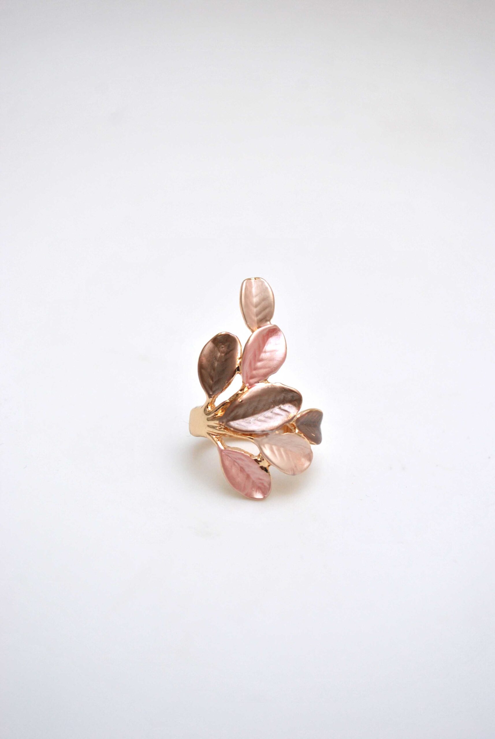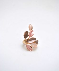 REF: 80150  – Anillo dorado con diseño de hojas en tonos rosa, nude y marrón perlado. Su forma envolvente y elegante lo convierte en el complemento perfecto para un look sofisticado y natural.