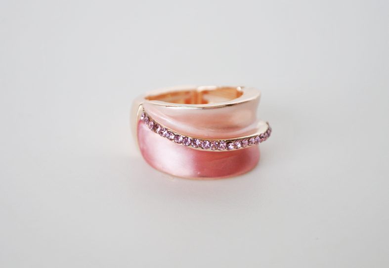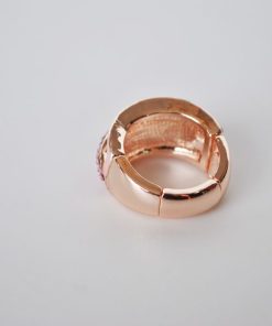 REF: 02/4418 – Anillo de mujer fabricado en bisutería oro rosa. Muy cómodo y se ajusta perfectamente al dedo gracias a la goma elástica que tiene. Destacan esmaltes mate combinados en diferentes tonos de rosa y elegantes brillantes rosas.