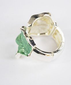 Elegante anillo de mujer fabricado en bisutería plateada. Muy cómodo y se ajusta perfectamente al dedo gracias a la goma elástica que tiene. Presenta el diseño en forma de hojas invertidas combinando esmaltes mate en color verde claro y verde más oscuro.