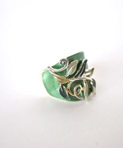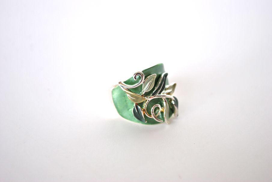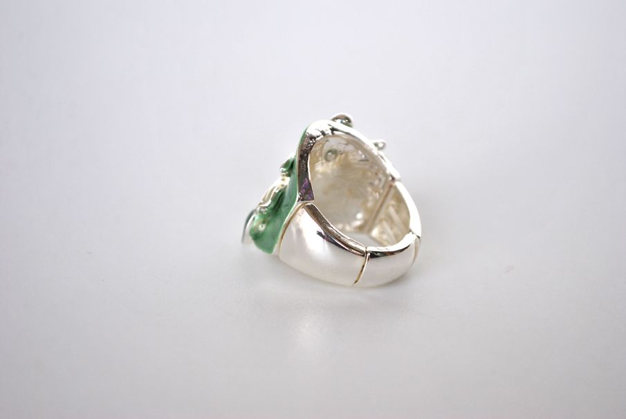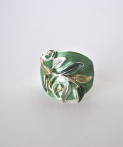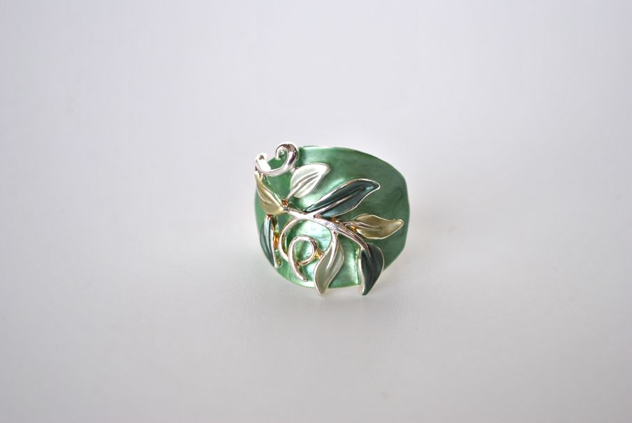 Elegante anillo de mujer fabricado en bisutería plateada. Muy cómodo y se ajusta perfectamente al dedo gracias a la goma elástica que tiene. Presenta el diseño en formade hojas combinando esmaltes mate en color verde oscuro con tonos verdes más claros.