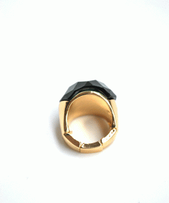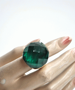 R03/5340 – Bonito y original anillo de mujer. Se trata de un anillo elástico, montado sobre bisutería dorada y decorado con una piedra redonda de cristal facetado en color verde botella.