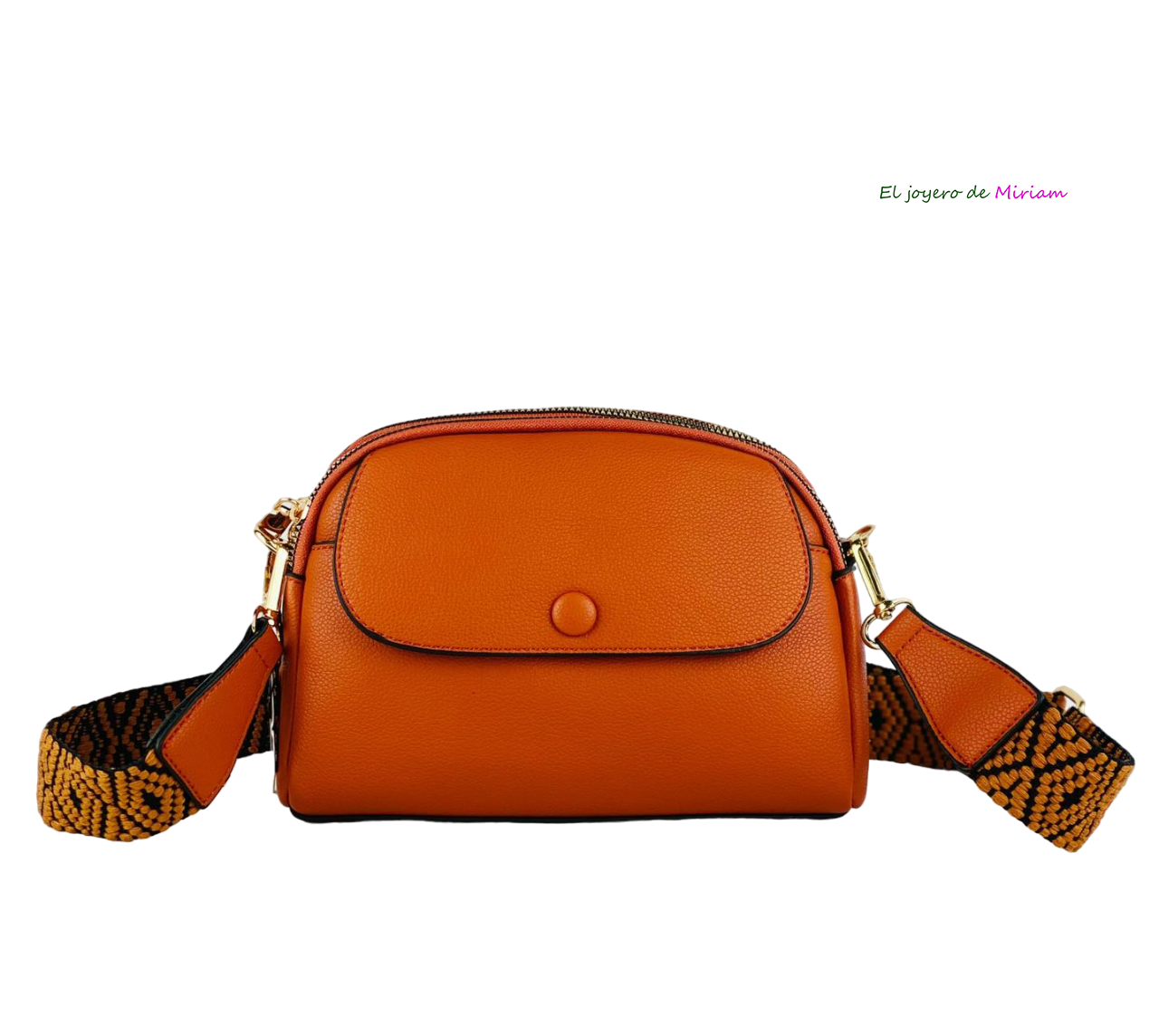 R04/5476 – Bonito y original bolso bandolera naranja teja. Se trata de un bolsito fabricado en polipiel de tacto suave y muy agradable y consta de una cremallera central, una solapa con botón delantero y otra cremallera más pequeña en la parte de atrás. Además consta de una bonita correa étnica de tela.