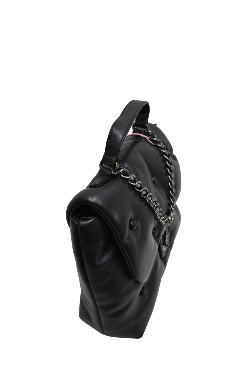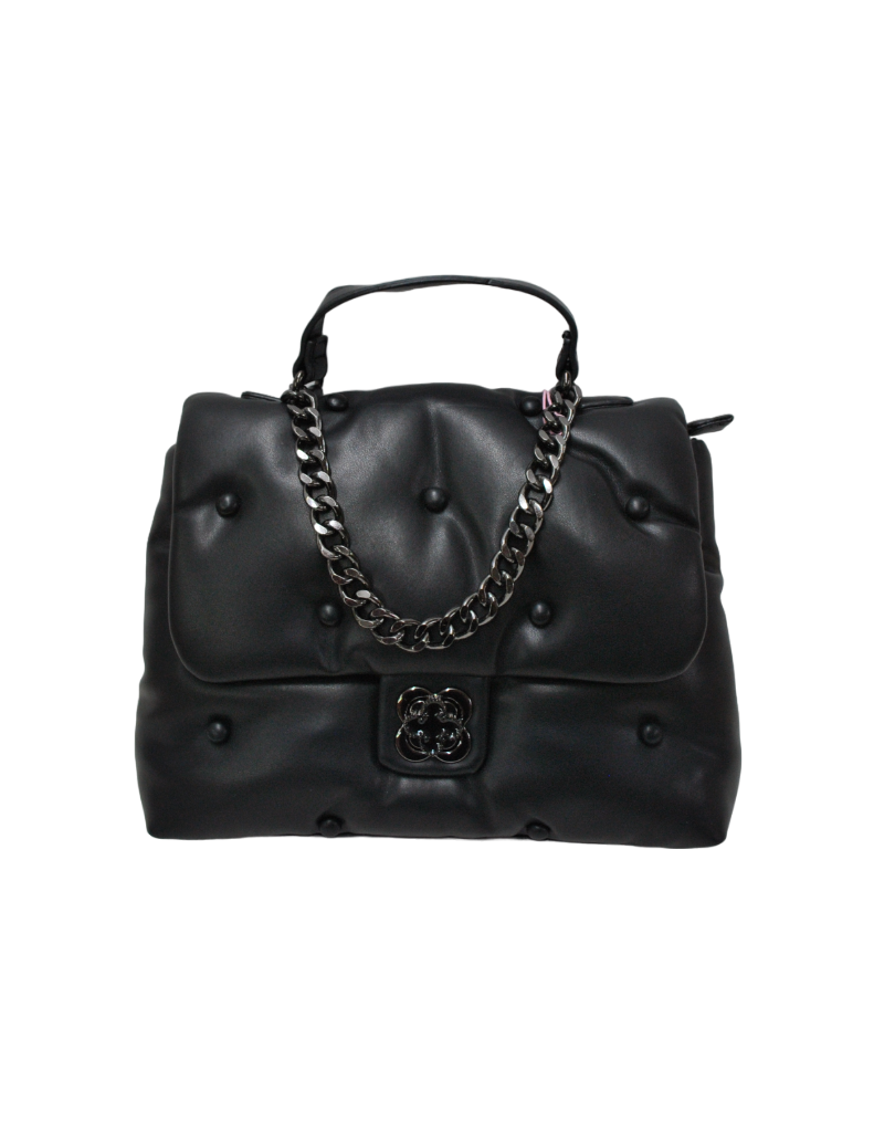 TD0901245865 – Bonito bolso de mano o bolso bandolera fabricado en polipiel negro. Se trata de un bolso acolchado con diseño que nos recuerdan a los modelos de Loewe con asa para llevarlo de mano, pequeña cadena plata envejecida también para llevarlo de mano o con correa ajustable para llevarlo colgado como bolso bandolera. Es muy suave y blandito, además consta de una cremallera central. Perfecto para completar tus looks, bolso versátil, original y elegante.