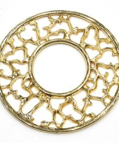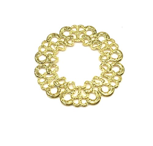 Espectacular base de filigrana redonda mediana de color oro brillo, fabricada en latón de alta calidad de origen europeo, la base mide unos 30 mms de diámetro.