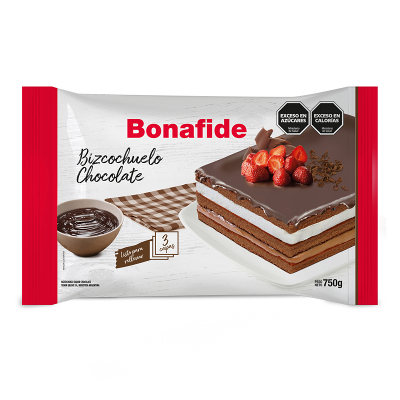 Bizcochuelo RECTANGULAR BONAFIDE 3 Capas Sabor Chocolate x750 Gramos