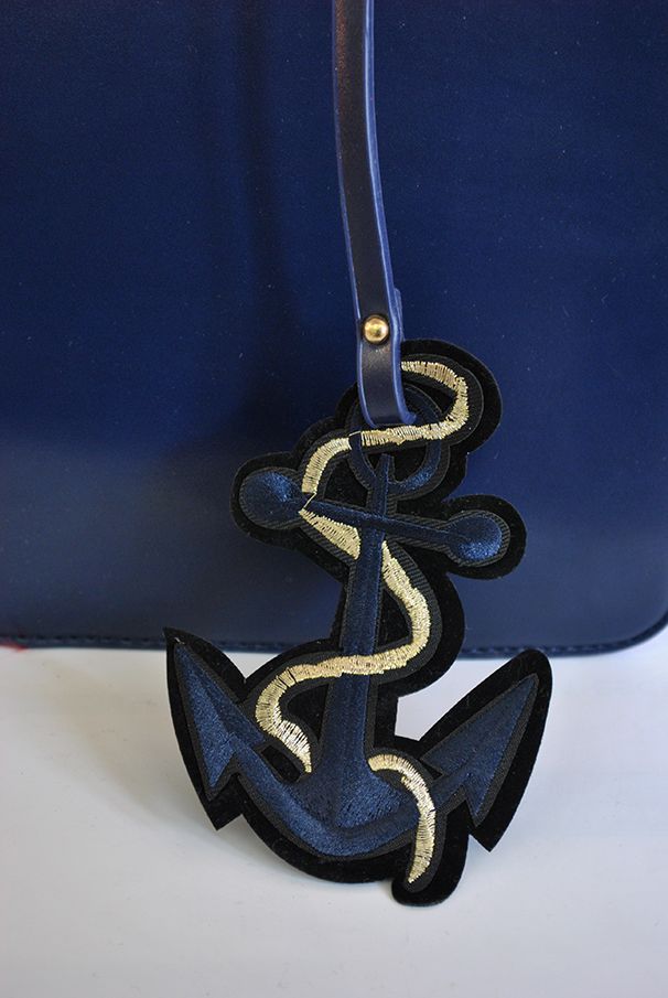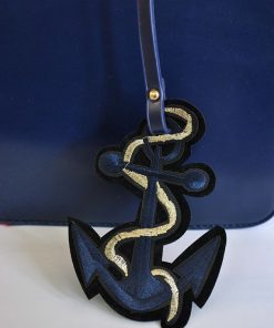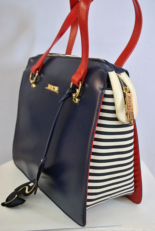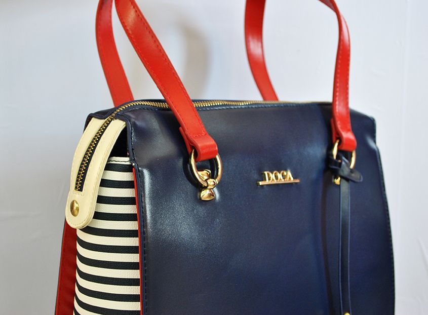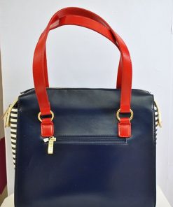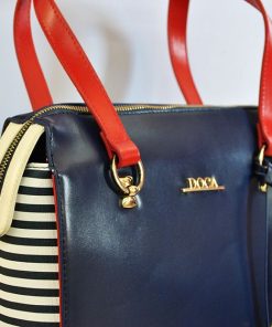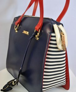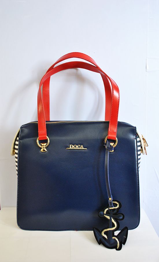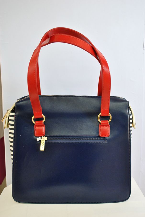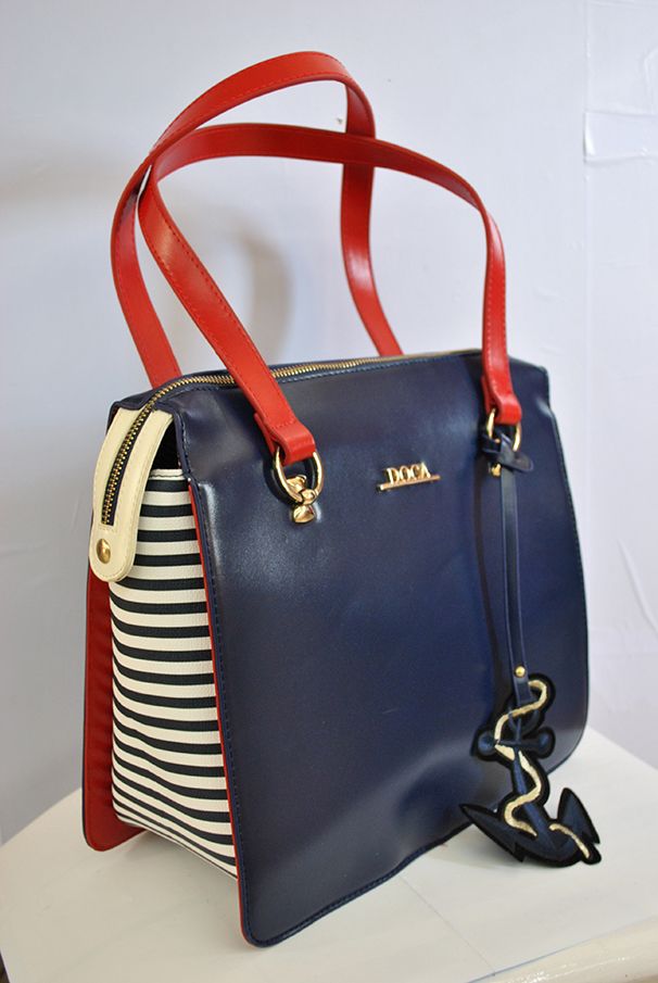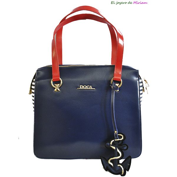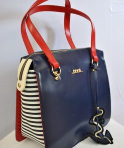 Original y estiloso bolso de mujer azul marino. Se trata de un bolso con asas rojas, tapa delantera y parte trasera azul marino con fuelle de estampado de rayas azul marino y blancas. Cremallera central y detalle de ancla colgando de los asas.