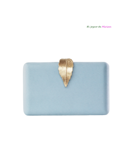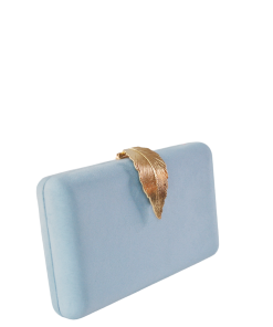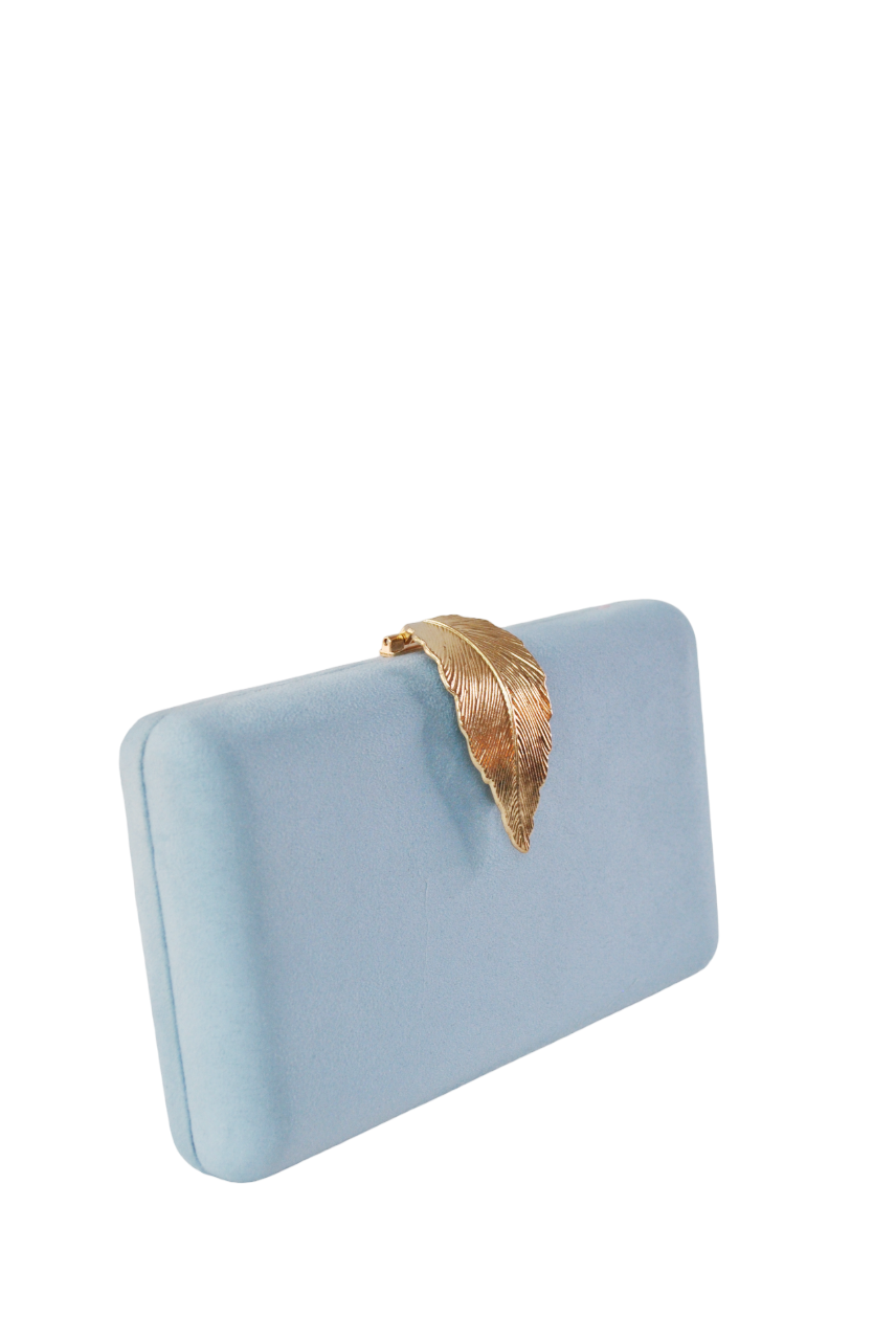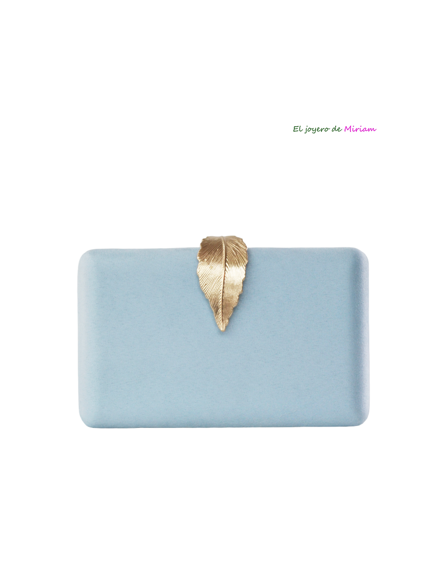 TD09308245858 – Original y elegante cartera de fiesta, bolso clutch de color azul cielo. Se trata de un bolso rectangular, con cadena y broche dorado. Está confeccionado con una preciosa tela de antelina y destaca una hoja de metal dorado en el broche. Además, en el interior se incluye una cadena larga de metal dorado.