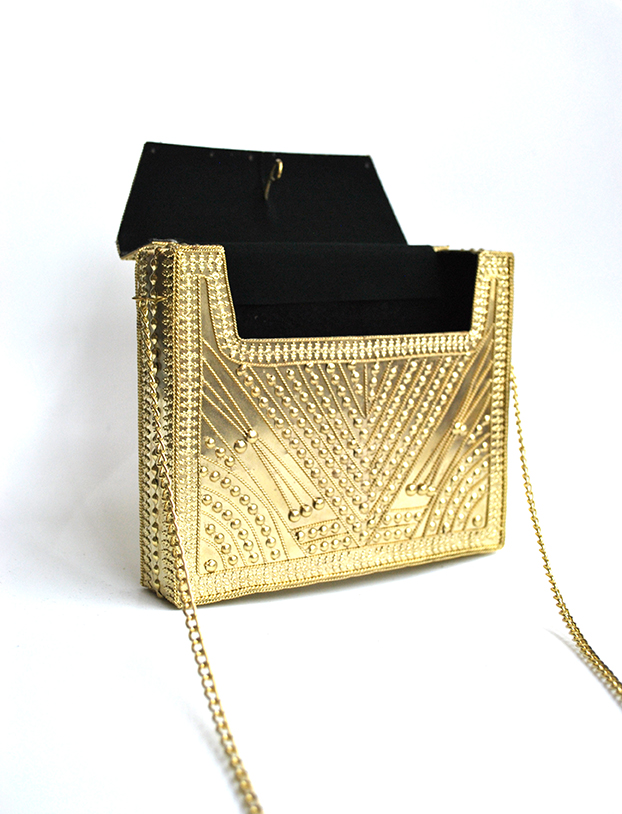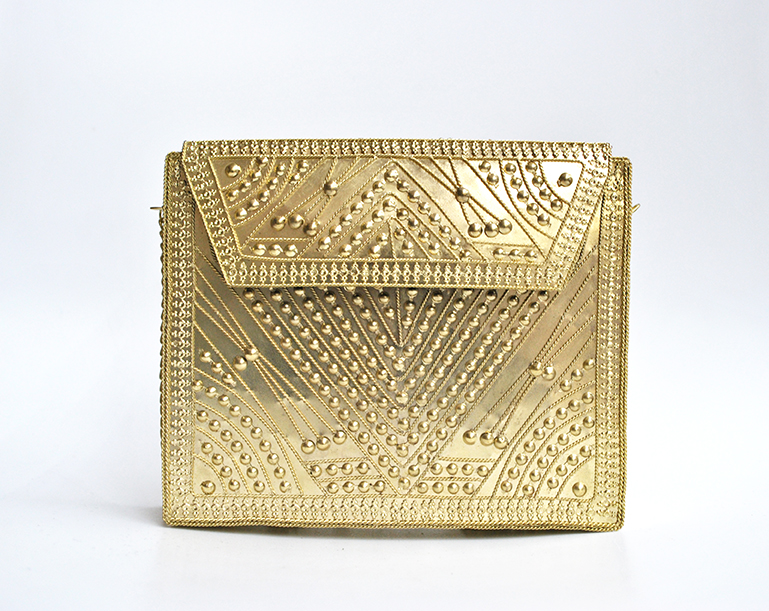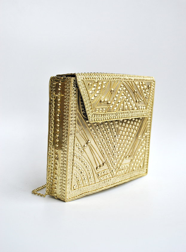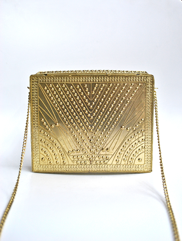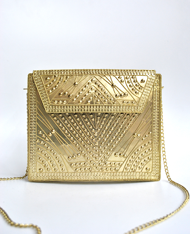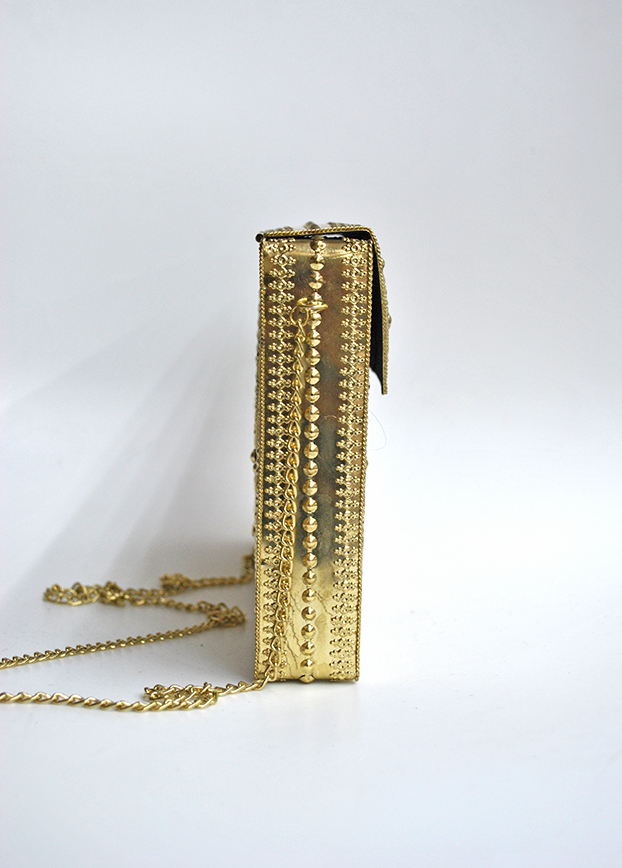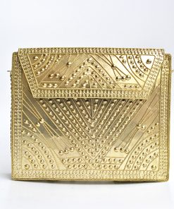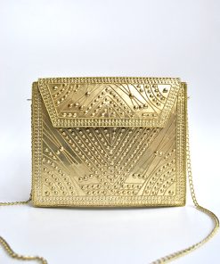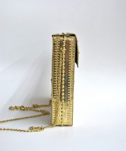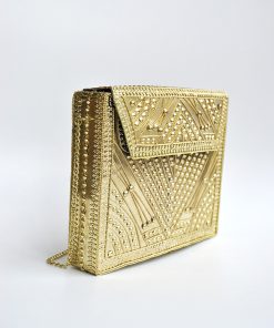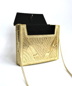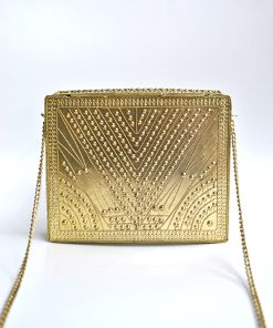 R03/5217 – Precioso y estiloso bolso de fiesta clutch dorado. Se trata de un bolso fabricado en latón dorado, muy ligero y cómodo de llevar, con cadena también dorada. Presenta el diseño rectangular, con solapa y con precisos labrados aportando gran elegancia al diseño.