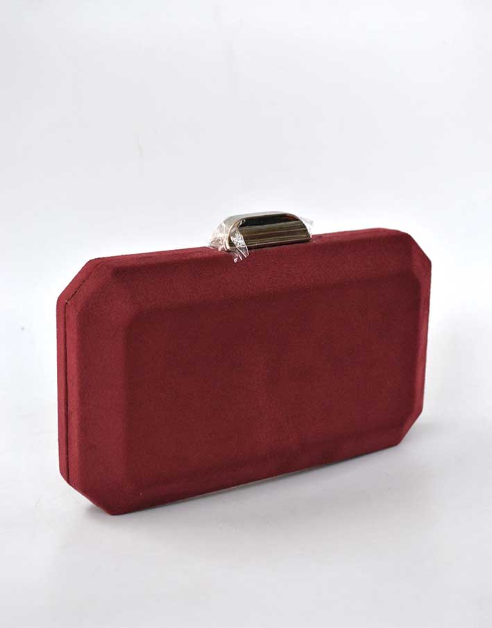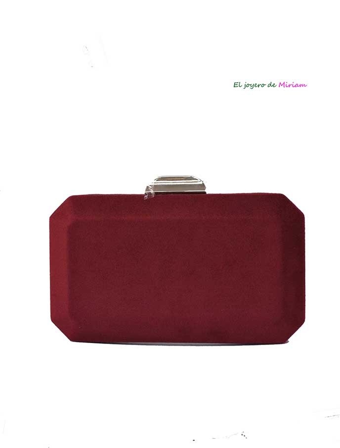 RAD0909245837 – Elegante bolso clutch o cartera de fiesta de color GRANATE fabricado en tela de antelina y, diseñado en ligera forma octagonal. Lleva la montura y la cadena larga en plateado , detalle de cierre alargado y rectangular, cómodo y original.
