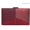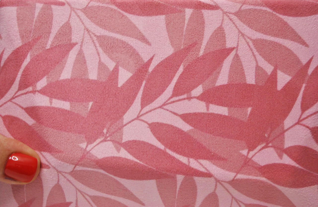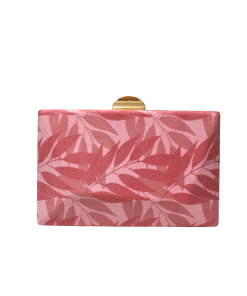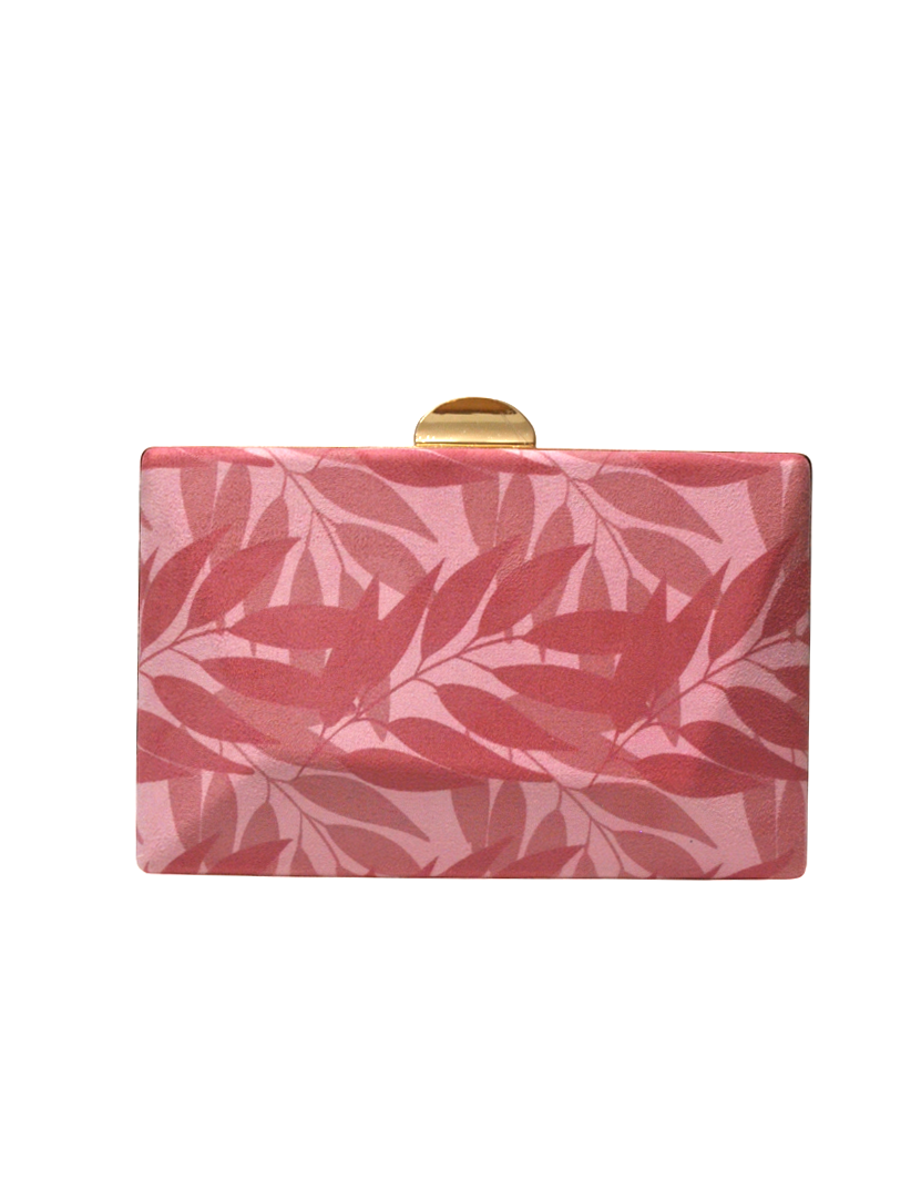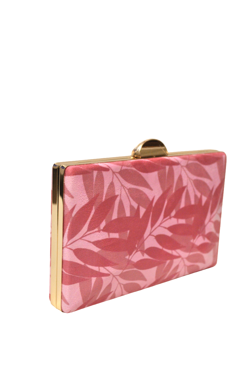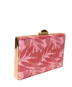 REF: DV015666 – Bonito bolso de fiesta clutch. Se trata de un bolso diseñado con montura y cierre de media luna en metal dorado con cadena larga en el interior para llevarlo colgado. Tanto la parte delantera como la parte trasera están forradas con una bonita tela con hojas o motivos vegetales combinado en tonos rosas diferentes.
