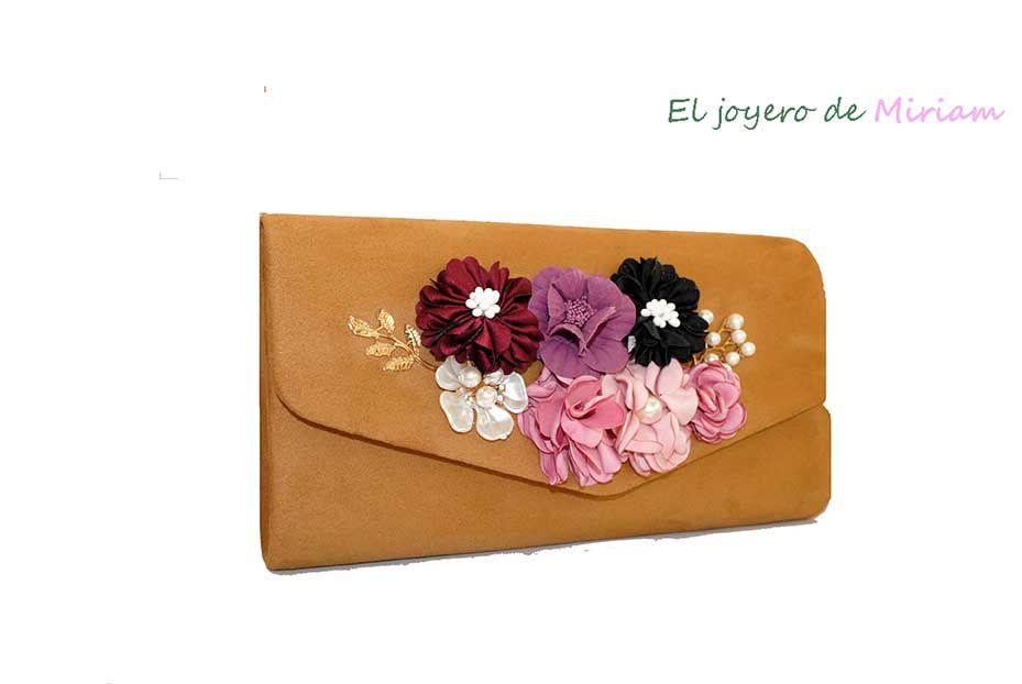 R18/930 – Elegante bolso clutch o cartera de fiesta de color MARRÓN – CAMEL, fabricado en antelina y diseñado con forma rectangular y solapa, de tipo sobre. Cómodo y original. El frente, está decorado con pequeñas perlas y flores de tela en diferentes colores; rosas, fucsias, bugamvillas…