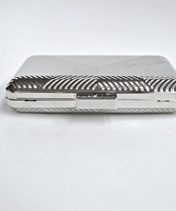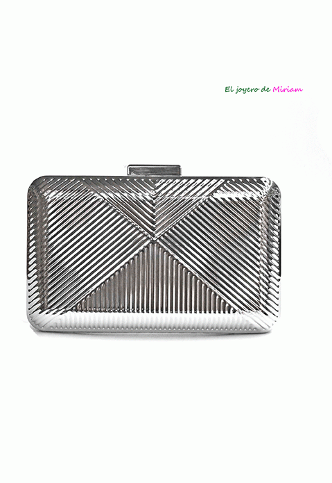 R03/5403 – Precioso y elegante bolso de fiesta clutch plateado. Se trata de un bolso fabricado en metal ligero plateado y con detalle de líneas grabadas formando triángulos. Incluye cadena plateada de metal para llevarlo más cómodamente colgado.