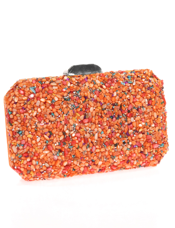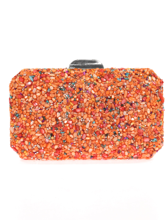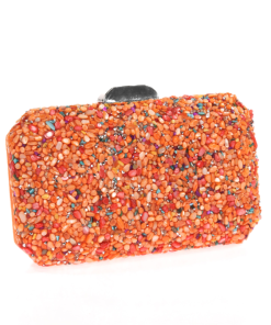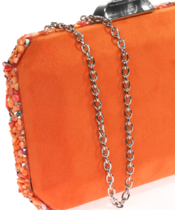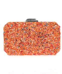 R04/5670 – Original y elegante bolso clutch NARANJA o cartera de fiesta en color MULTICOLOR con detalle pedrerías en el frontal. Efecto de antelina en la parte trasera. Consta de cadena plateada en el interior para llevarlo más cómodamente colgado y además, el cierre es metálico en plateado. Un bolso ideal para que seas la invitada perfecta en eventos especiales, bautizos y ceremonias.