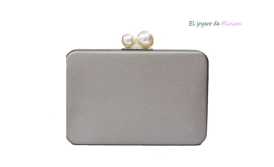 Elegante bolso clutch o cartera de fiesta de color PLATA ENVEJECIDA fabricado en polipiel, diseñado en forma de caja. Lleva la montura y la cadena larga en dorado, detalle de cierre de dos perlas.