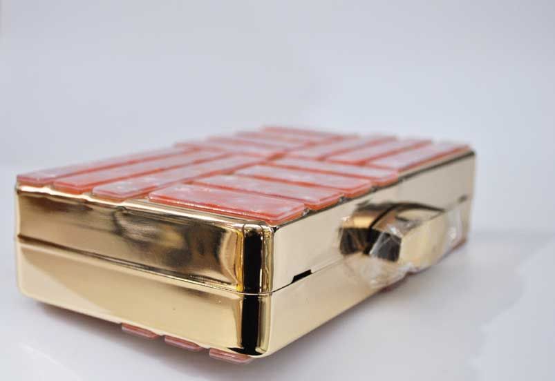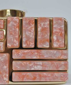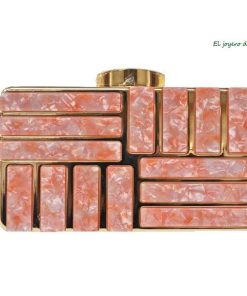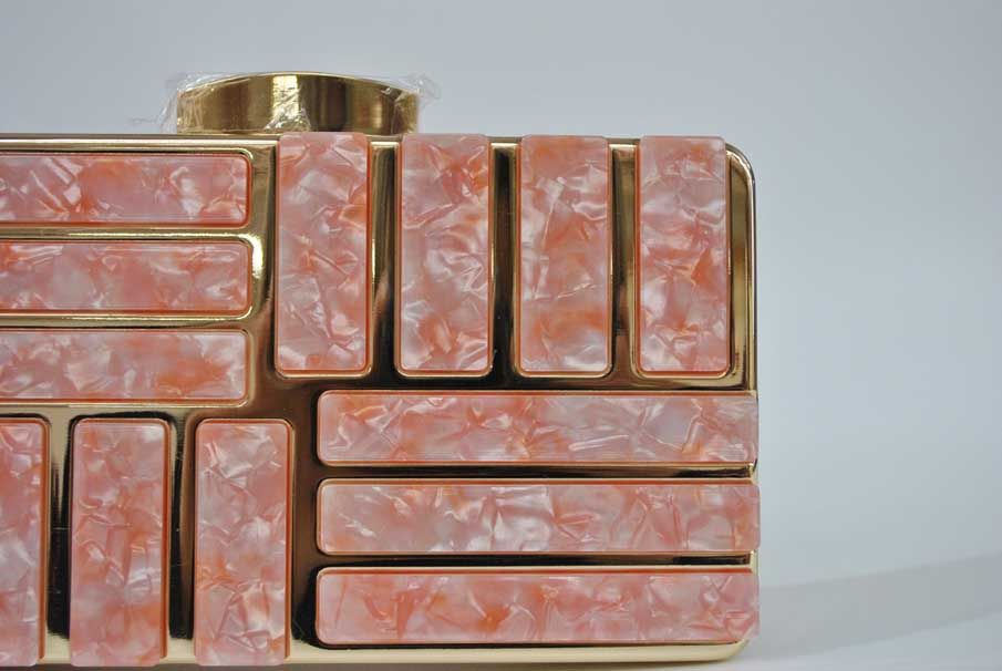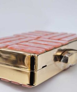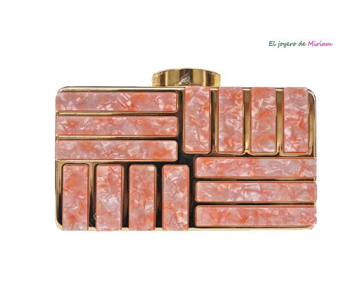 R02/4500 -Precioso bolso de fiesta o bolso clutch ROSA, fabricado en metal ligero dorado y decorado con incrustaciones de carey sintético en tonos rosas y diseñado en una original forma de cajita. Sin duda, un bolso elegante y con diseño debido a sus líneas rectas, un bolso ideal para bodas o para la noche. Dispone de cadena dorada para colgar.