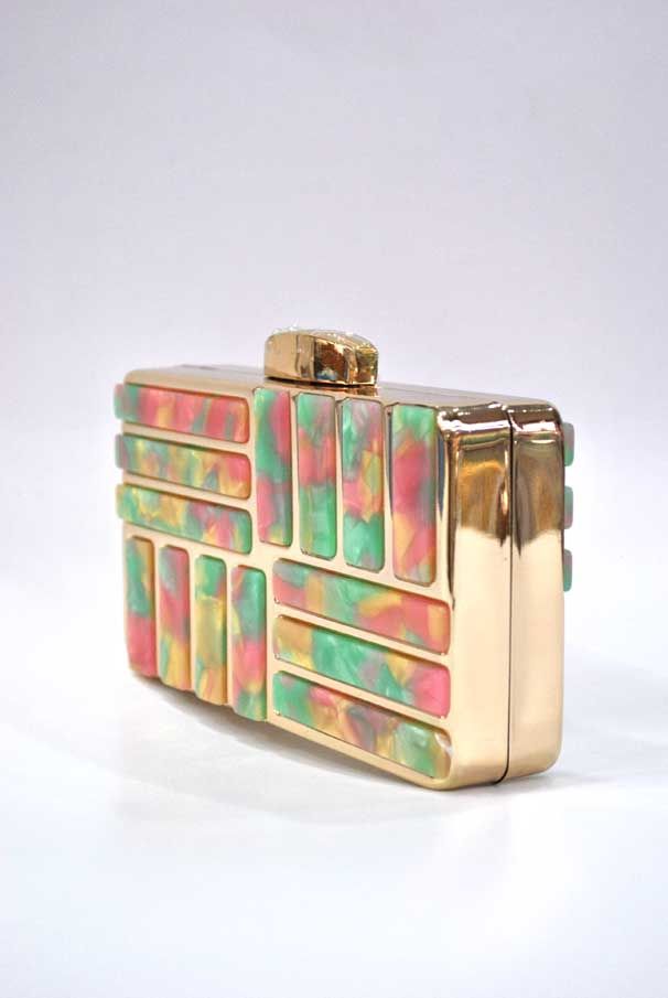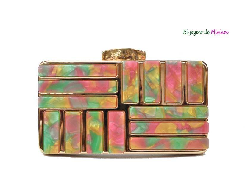 R02/4801 –Precioso bolso de fiesta MULTICOLOR, fabricado en metal ligero dorado y decorado con incrustaciones de carey sintético en forma de cajita. Predominan tonos verde agua, corales y amarillos, muy combinados entre sí. Sin duda, un bolso elegante y con diseño debido a sus líneas rectas, un bolso ideal para bodas o para la noche. Dispone de cadena dorada para colgar.