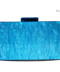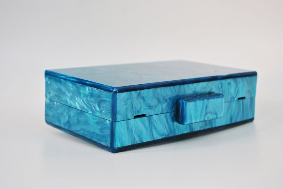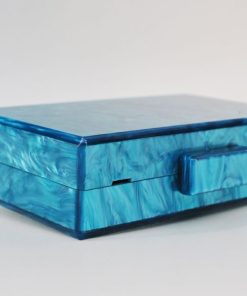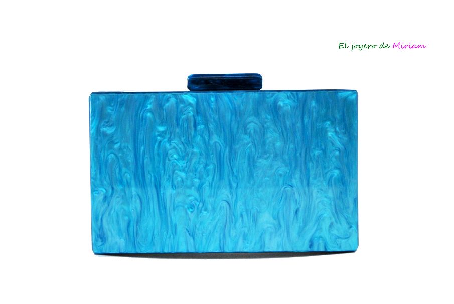 Precioso bolso de fiesta, fabricado en carey sintético de color AZUL MAR – AZUL PETRÓLEO. Diseñado en forma de cajita, un bolso elegante y con diseño debido a sus líneas rectas, un bolso ideal para bodas o para la noche. Consta de cierre de imán e incluye cadena corta y larga dorada en el interior para llevarlo más cómodamente colgado.