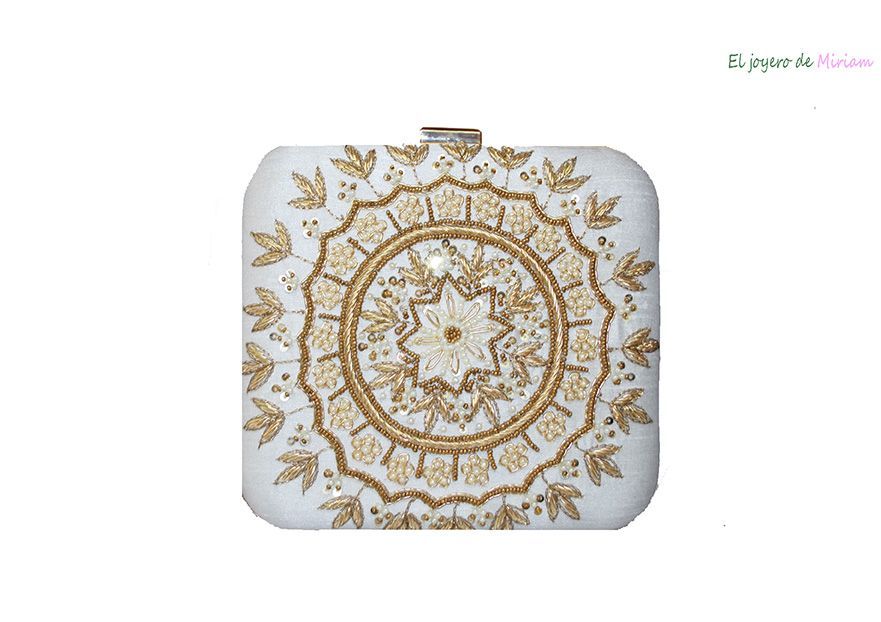 R19/2756 – Elegante y original bolso clutch, cartera de fiesta fabricado íntegramente a mano en tela plateada clutch ideal para madrinas de ceremonias. El frente está decorado a base cuentas doradas algún que otro cristal blanco, formando un precioso mandala, todo ello hecho a mano. Se trata de un clutch ideal para lucir en cualquier ceremonia o cena especial. Incluye cadena dorada para llevarlo más cómodamente.