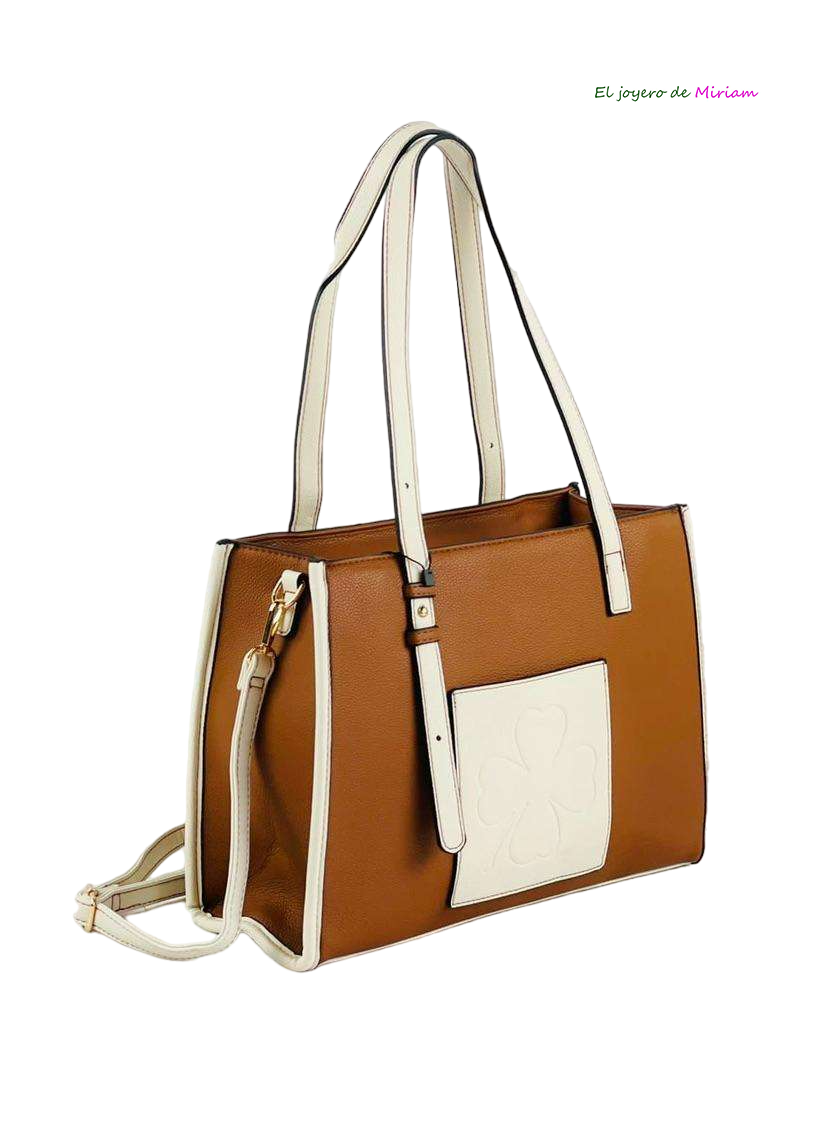 R04/5488 – Bonito y original bolso de mujer inspiración Loewe. Se trata de un bolso fabricado en polipiel de color camel combinado con asas y detalles en beige. Consta de una cremallera central y lo puedes llevar tanto de bolso de mano o bien de bandolera ya que cuenta con una correa autoajustable para llevarlo más cómodamente colgado.