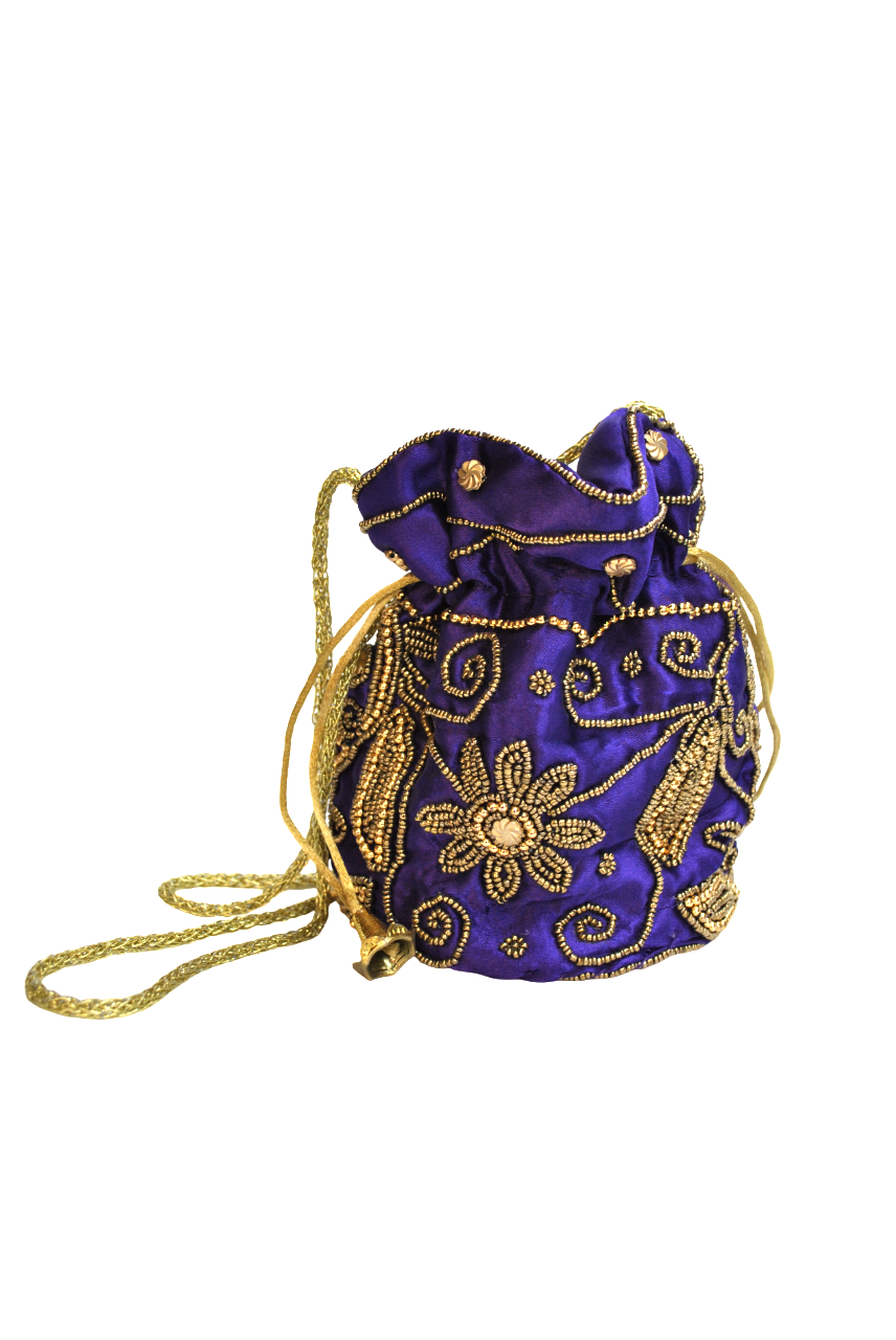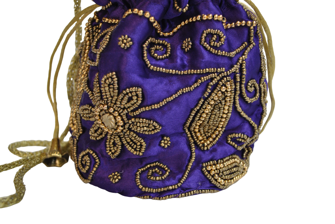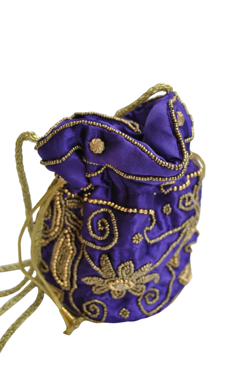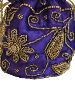 R04-5439- Bolso de fiesta o bolso bombonera de color morado confeccionado en tela de raso y decoraciones en dorado. Un bolso original y con un estilo diferente para completar tu vestido de fiesta o tus looks diarios