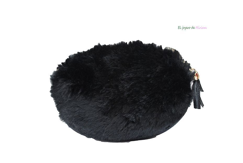 Original bolso con forma ovalada fabricado con pelo sintético de color negro, muy suave. Consta de cadena en el interior para llevarlo más cómodamente colgado como bolso bandolera.