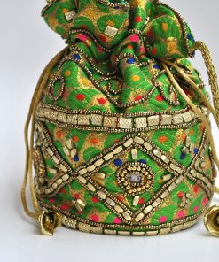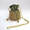 R03/5219 – Bonito bolso clutch o bolso bombonera de fiesta. Se trata de una bombonera confeccionada en tela verde con puntitos pequeños multicolor y, decorada artesanalmente con cuentas doradas. Además, presenta la cadena de cordón dorado para llevarlo más cómodamente colgado.