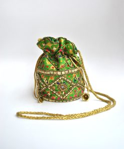 R03/5219 – Bonito bolso clutch o bolso bombonera de fiesta. Se trata de una bombonera confeccionada en tela verde con puntitos pequeños multicolor y, decorada artesanalmente con cuentas doradas. Además, presenta la cadena de cordón dorado para llevarlo más cómodamente colgado.