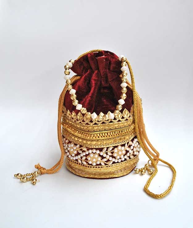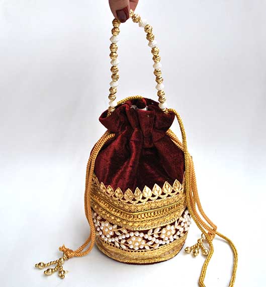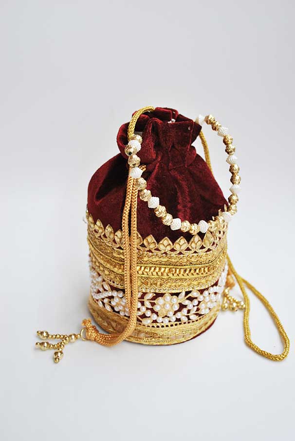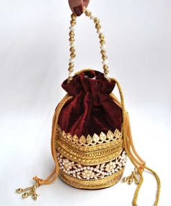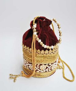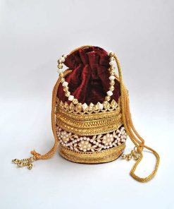 0924504BI-5824 – Precioso bolso de fiesta clutch o bolso bombonera granate. Se trata de un bolsito confeccionado en tela granate de terciopelo y está decorado parcialmente con perlas blancas y cuentas doradas. Llévalo colgado o bien en la mano, aportando un toque chic gracias a su bonita cadena de bolitas doradas y perlas.