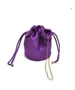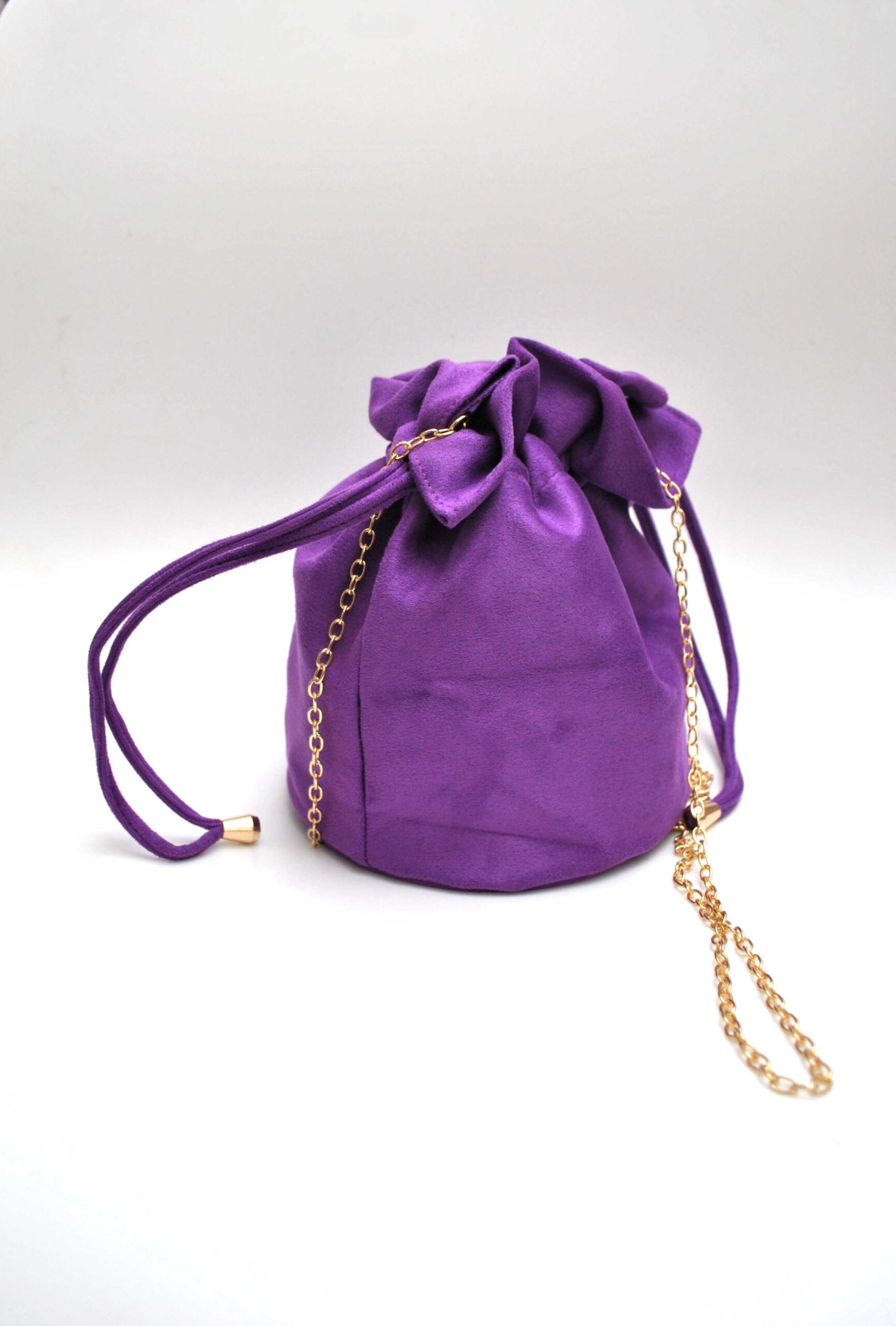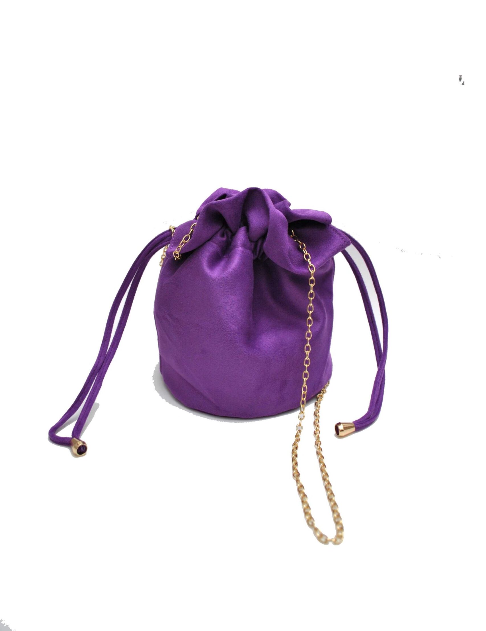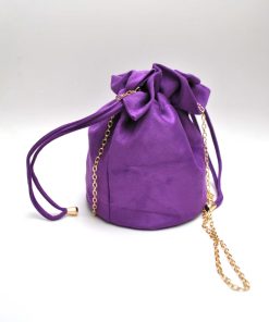 REF: 20428 – Precioso bolso de fiesta clutch o bolso bombonera en color morado. Está confeccionado en tela suave de antelina en color morado y, en el interior se incluye cadena larga dorada para llevarlo cómodamente colgado al hombro.