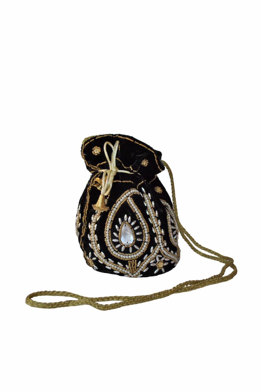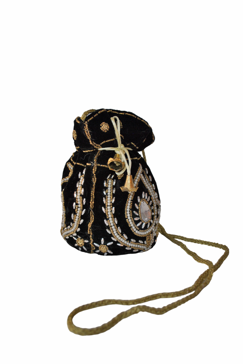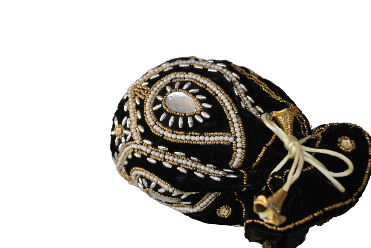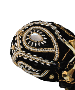 R0924504BI5824 – Bonito bolso bombonera confeccionada a mano en tela de terciopelo negra. Presenta pequeñas cuentas blancas perla y doradas, además, de cristales blancos. Lo puedes llevar como bolso de mano o bien como bolso bandolera gracias a su cordón dorado que lleva como cadena.