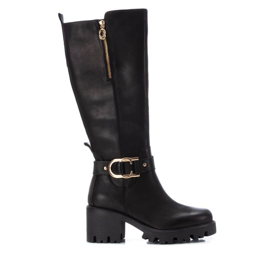 Bota de mujer, de la marca Carmela. Fabricada en piel de alta calidad. Cierre mediante cremallera lateral. Tirador trasero que facilita la puesta. Correa con detalle metálico con logo de la marca y cremallera decorativa en el lateral. Tacón ancho de 7 cm con suela track antideslizante.