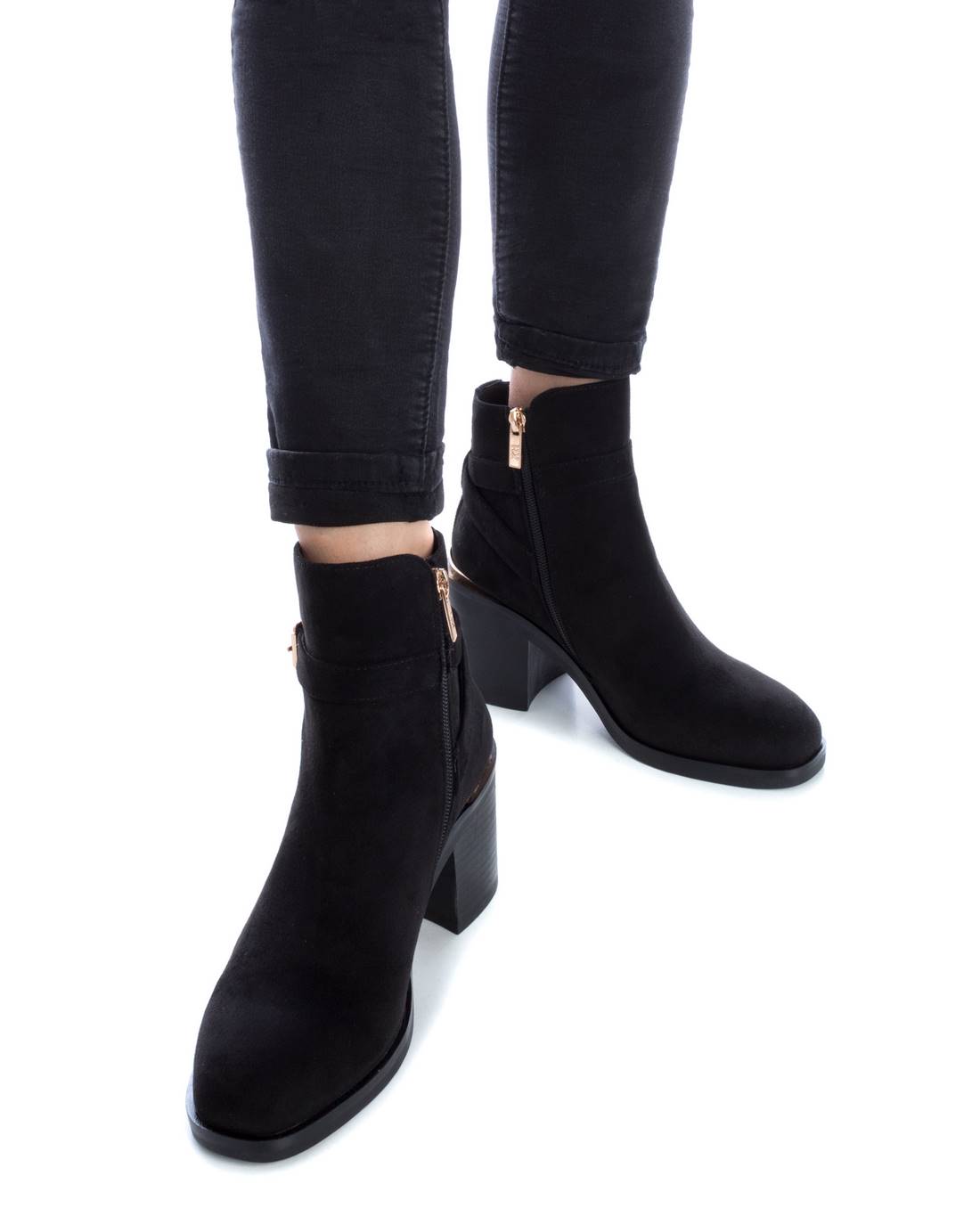 Botín de mujer, de la marca Xti. Fabricado en suave antelina. Cierre mediante cremallera lateral. Detalle de correas con hebilla. Cómodo tacón ancho de 7cm con suela de goma antideslizante. Este modelo ha obtenido el certificado vegano por la organización mundial PETA (Organización de los derechos de los animales).