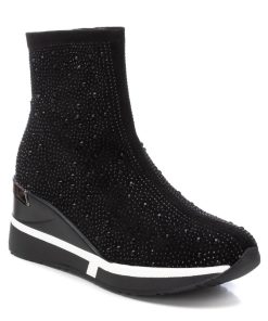 Botín deportivo de mujer, de la marca Xti. Fabricado en material textil, decorado con cristales decorativos al tono. Con cierre cremallera interior para facilitar la puesta. Con suelo de goma antideslizante. Un básico para tu armario en invierno. Con plantilla extraíble. Este modelo ha obtenido el certificado vegano por la organización mundial PETA (Organización de los derechos de los animales).