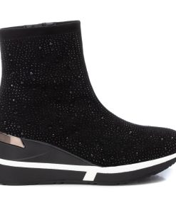 Botín deportivo de mujer, de la marca Xti. Fabricado en material textil, decorado con cristales decorativos al tono. Con cierre cremallera interior para facilitar la puesta. Con suelo de goma antideslizante. Un básico para tu armario en invierno. Con plantilla extraíble. Este modelo ha obtenido el certificado vegano por la organización mundial PETA (Organización de los derechos de los animales).