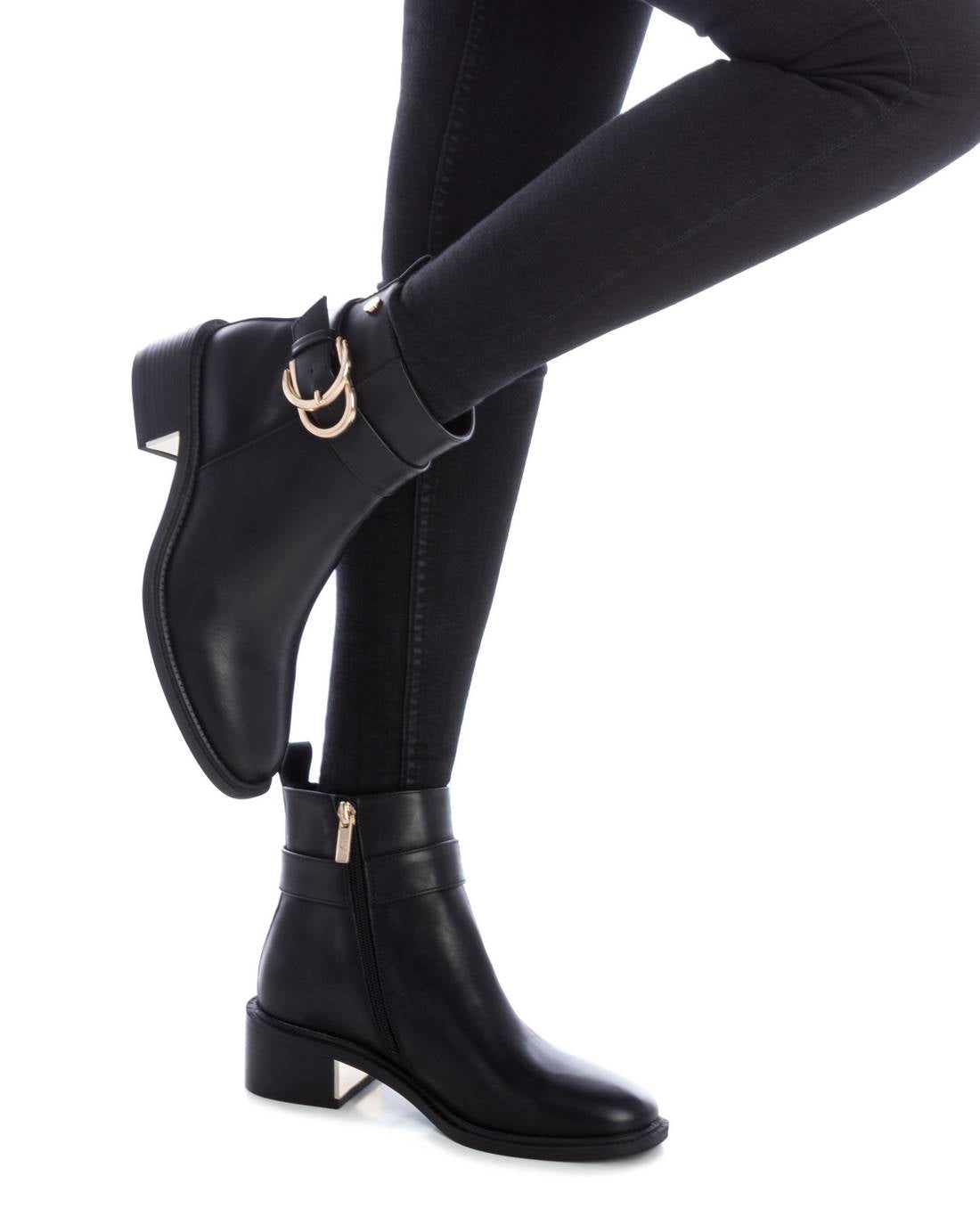 Botín de mujer, de la marca Xti. Fabricado en material que imita la piel. Cierre cremallera interior. Correa decorativa y hebilla metálica. Ideal para el invierno. Este modelo ha obtenido el certificado vegano por la organización mundial PETA (Organización de los derechos de los animales).