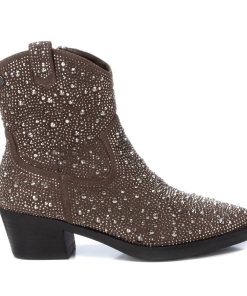 Botín estilo cowboy de mujer, de la marca Xti. Fabricado en antelina con piedras decorativas de fantasía. Cierre cremallera. Con punta afilada y un tacón ancho de 5 cm etilo cowboy y suela antideslizante. Este modelo ha obtenido el certificado vegano por la organización mundial PETA (Organización de los derechos de los animales).