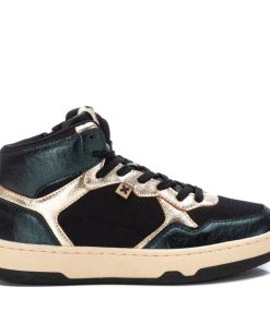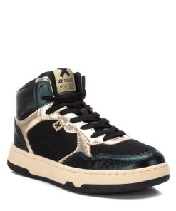 Botín de mujer, de la marca Xti. Fabricado en un material que imita la piel. Con acabados metalizados. Cierre cremallera en el interior, además de cordones regulables para un mayor ajuste. Con plantilla extraíble. Este modelo ha obtenido el certificado vegano por la organización mundial PETA (Organización de los derechos de los animales).