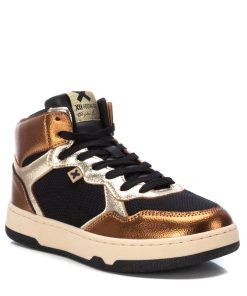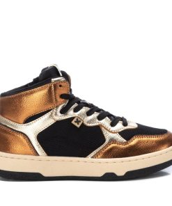 Botín de mujer, de la marca Xti. Fabricado en un material que imita la piel. Con acabados metalizados. Cierre cremallera en el interior, además de cordones regulables para un mayor ajuste. Con plantilla extraíble. Este modelo ha obtenido el certificado vegano por la organización mundial PETA (Organización de los derechos de los animales).