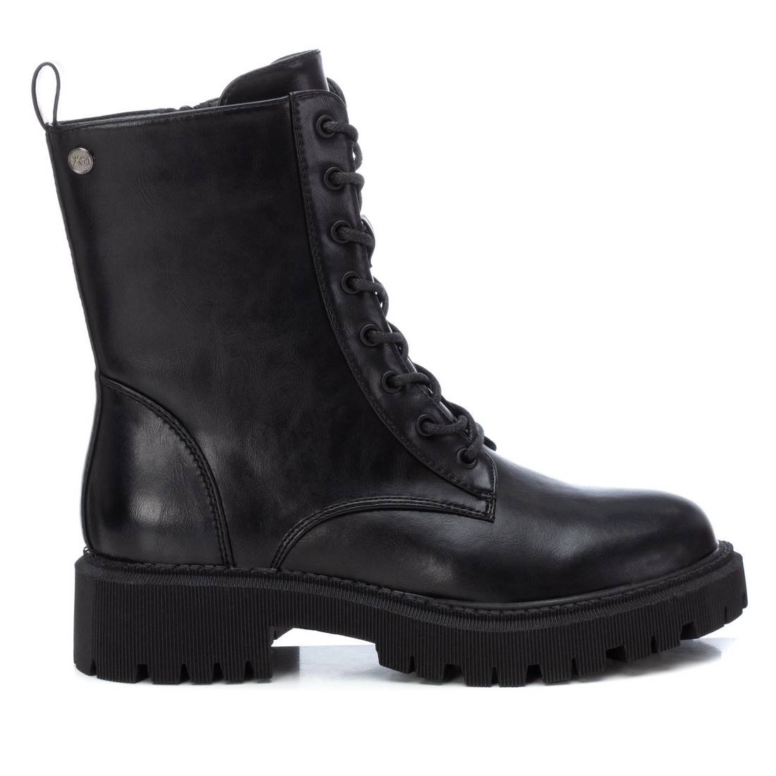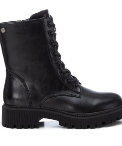 Botín de mujer, de la marca Xti. Fabricado en un material que imita la piel. Cierre mediante cremallera lateral y cordones ajustables para un mayor ajuste. Tirador trasero para facilitar la puesta. Piso track con tacón de 4 cm. Un botín básico para dar un toque a tus looks de invierno. Este modelo ha obtenido el certificado vegano por la organización mundial PETA (Organización de los derechos de los animales).