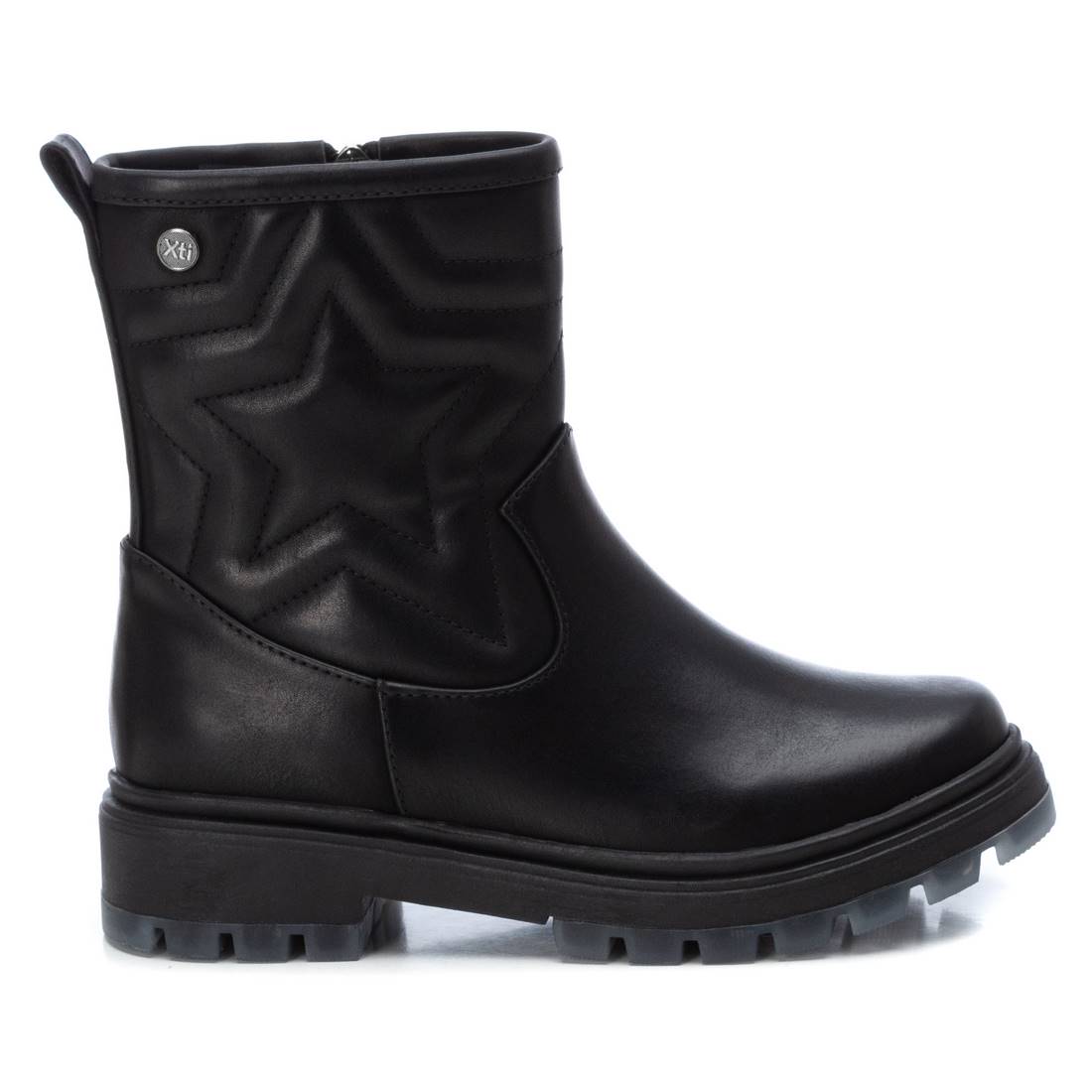 Botín de niña, de la marca Xti Kids. Fabricado en material que imita a la piel con estrella marcada mediante pespunte y un ligero acolchado. Cierre mediante cremallera interior. Altura caña: 14 cm. Gruesa suela de goma antideslizante. Este modelo ha obtenido el certificado vegano por la organización mundial PETA (Organización de los derechos de los animales).