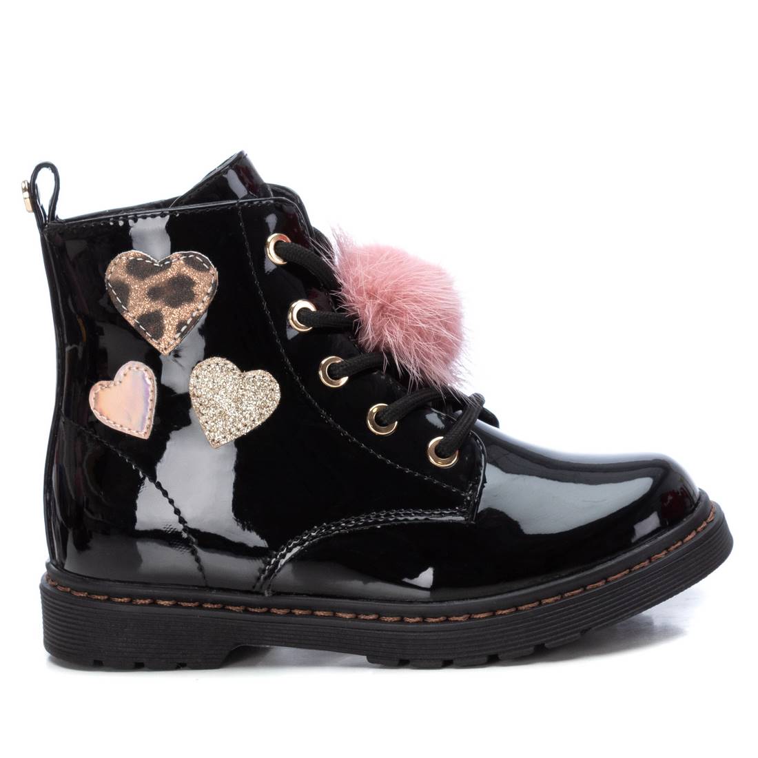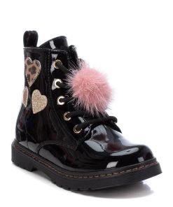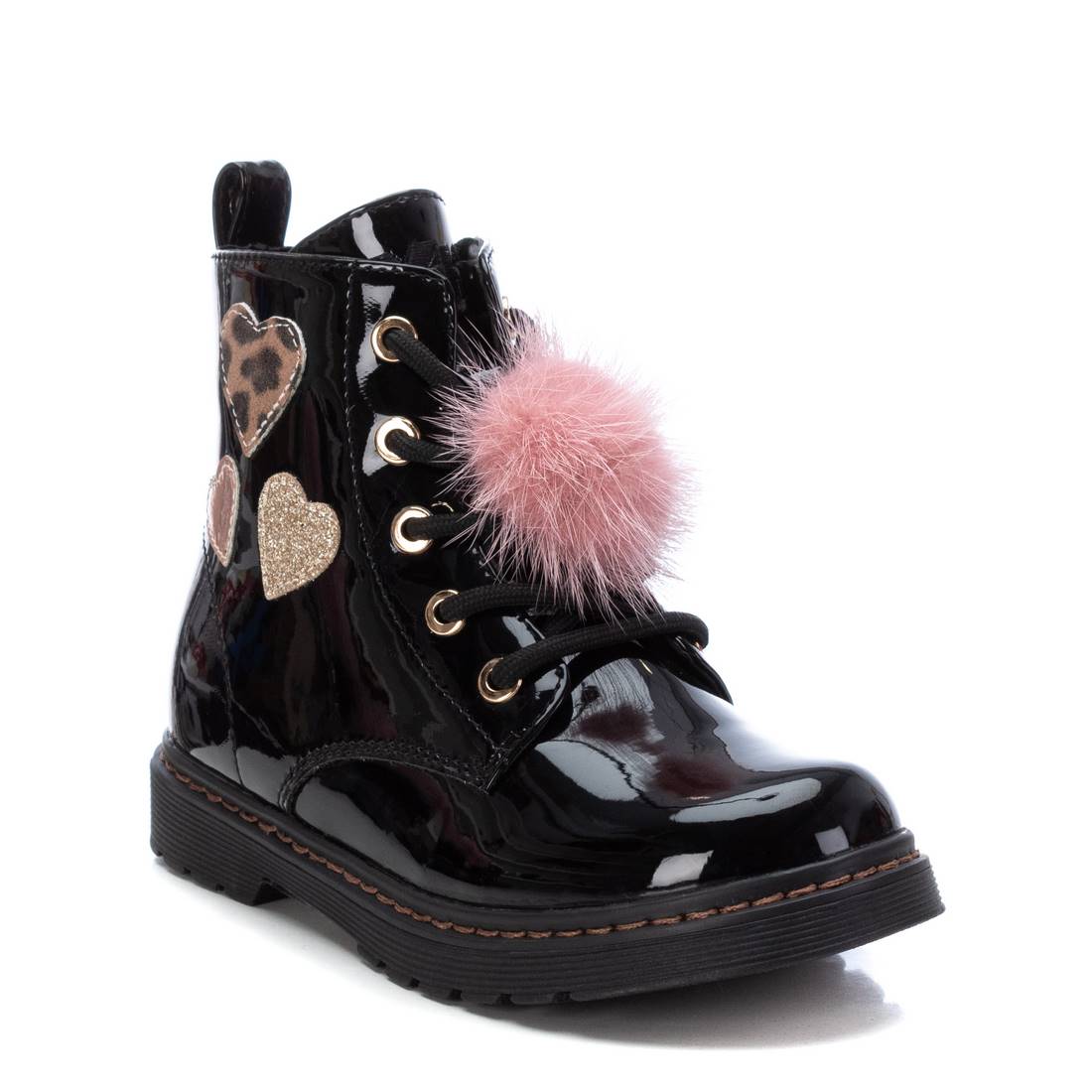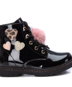 Botín de niña de la marca Xti. Fabricado en charol, con decoración de corazones en diferentes materiales, combina perfecto con todos sus outfits. Con cierre mediante cremallera y además pompom decorativo en los cordones.Suela de goma antideslizante.Este modelo ha obtenido el certificado vegano por la organización mundial PETA (Organización de los derechos de los animales).