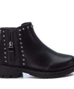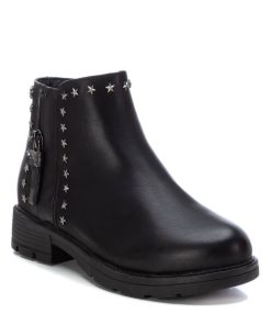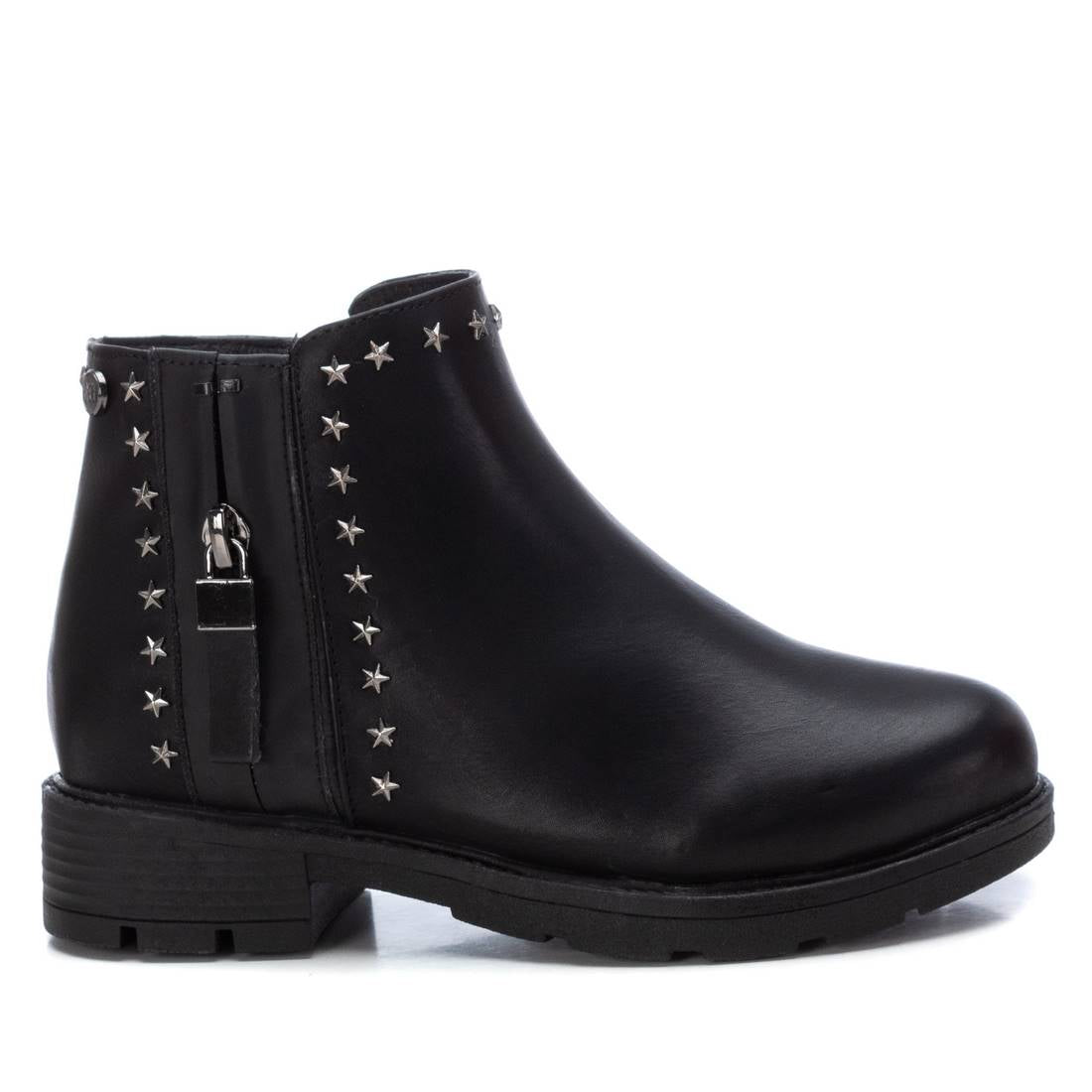 Botín de niña, de la marca Xti Kids. Fabricado en material que imita la piel. Cierre mediante cremallera lateral. Tachas decorativas con forma de estrella. Cremallera decorativa en el lateral exterior. Suela de goma antideslizante. Este modelo ha obtenido el certificado vegano por la organización mundial PETA (Organización de los derechos de los animales).