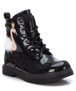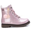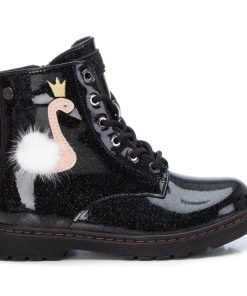 Botín de niña, de la marca Xti Kids. Fabricado en glitter forrado con plástico transparente. Cierre mediante cremallera lateral y cordones ajustables. Tirador trasero para facilitar la puesta. Detalle decorativo en el lateral. Suela de goma antideslizante. Este modelo ha obtenido el certificado vegano por la organización mundial PETA (Organización de los derechos de los animales).