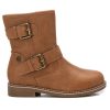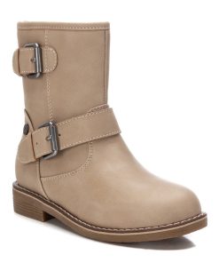 Botín de niña, de la marca Xti Kids. Fabricado en material que imita a la piel, cierre mediante cremallera interior. Correas con hebilla metalizadas regulables. Gruesa suela dentada de goma antideslizante. Este modelo ha obtenido el certificado vegano por la organización mundial PETA (Organización de los derechos de los animales).