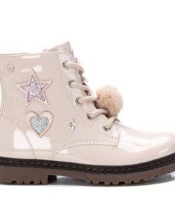 Botín de niña de la marca Xti Kids, fabricado en charol. Con cremallera interior para facilitar el uso y comodidad. Cordones al tono con un pompón decorativo. Detalles con glitter. Tirador trasero para facilitar su puesta. Suela de goma antideslizante.
