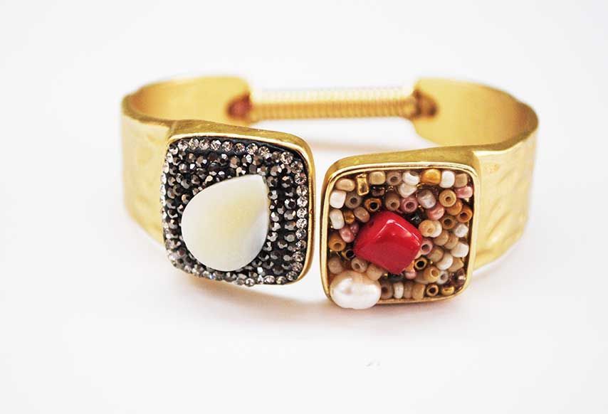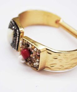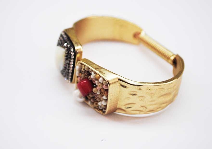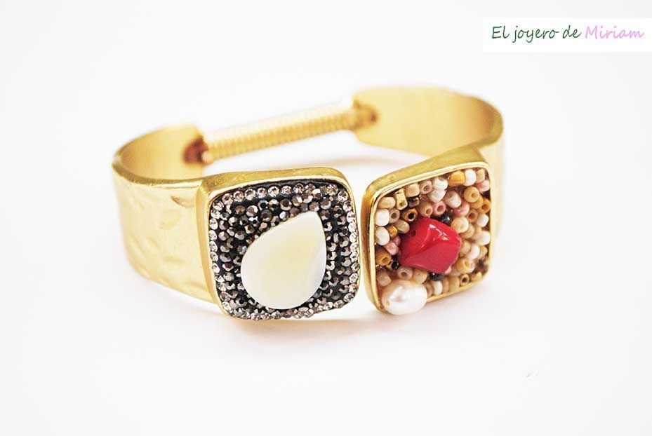R19/2879 -Elegante y original pulsera brazalete de mujer, autoajustable. Se trata de una pulsera fabricada en metal ligero mate, color dorado. Presenta una decoración muy llamativa, brillantes en plata vieja, cuentas marrones, una lágrima beige y una aplicación de resina en color rojo.